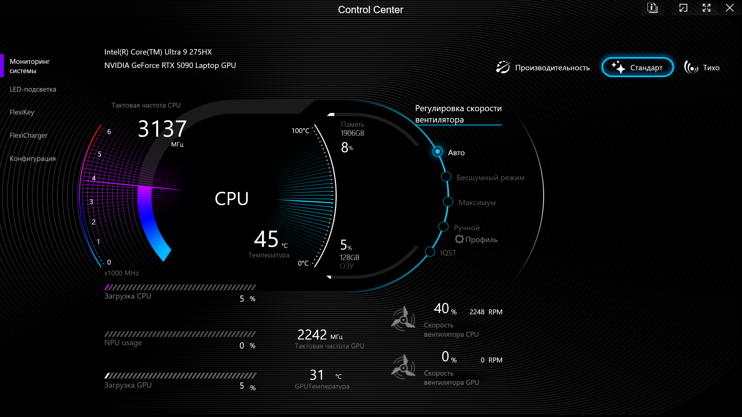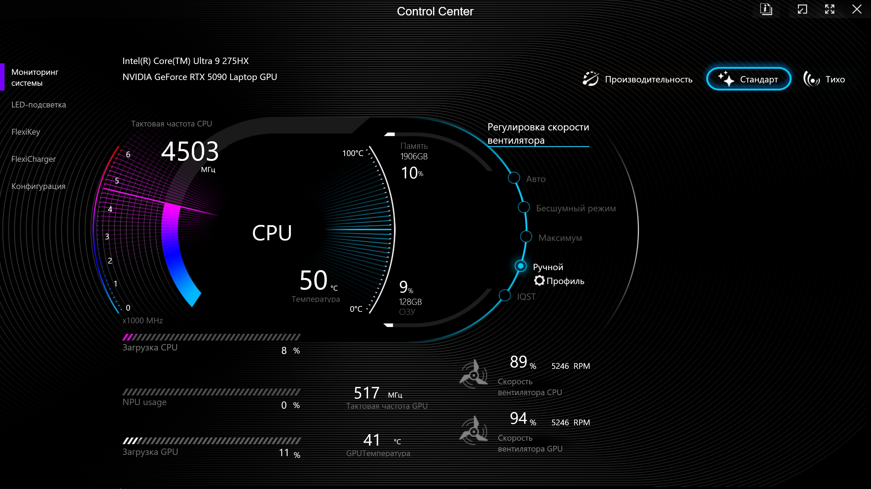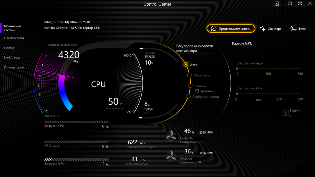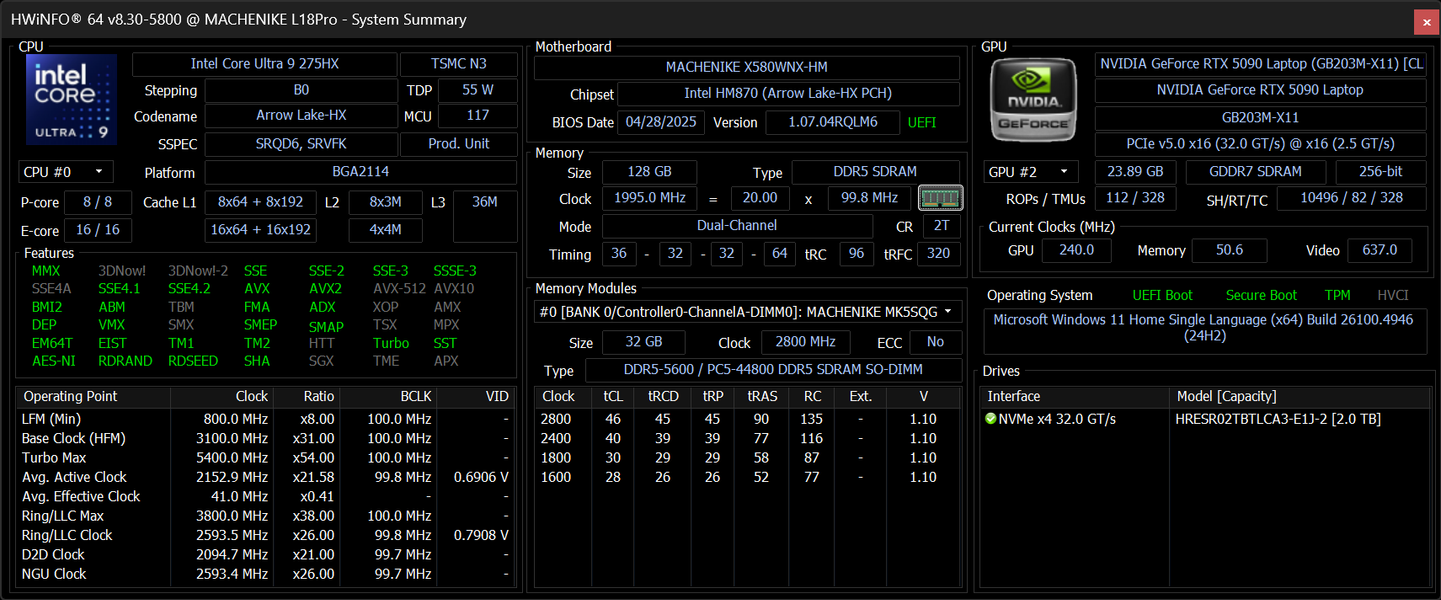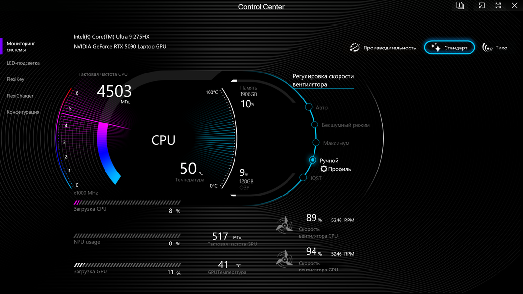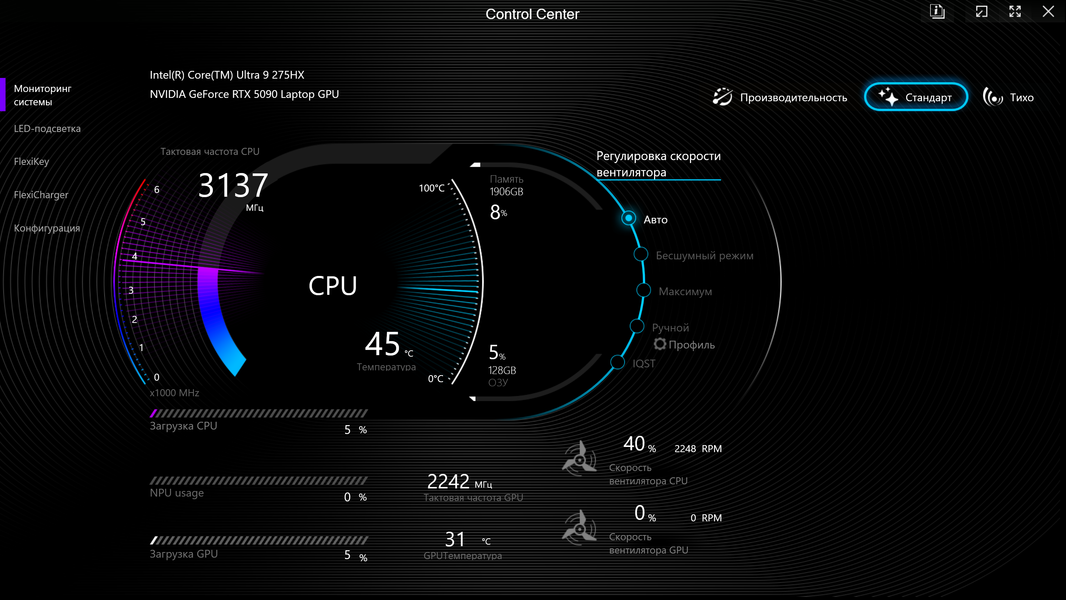 | Процессор | Intel Core Ultra 9 275HX: 8×P-ядер, 2,7/5,4 ГГц; 16×E-ядер; 2,1/4,6 ГГц; TDP 45—55/160 Вт, Tjmax 105 °C; Intel AI Boost NPU 13 TOPS | |