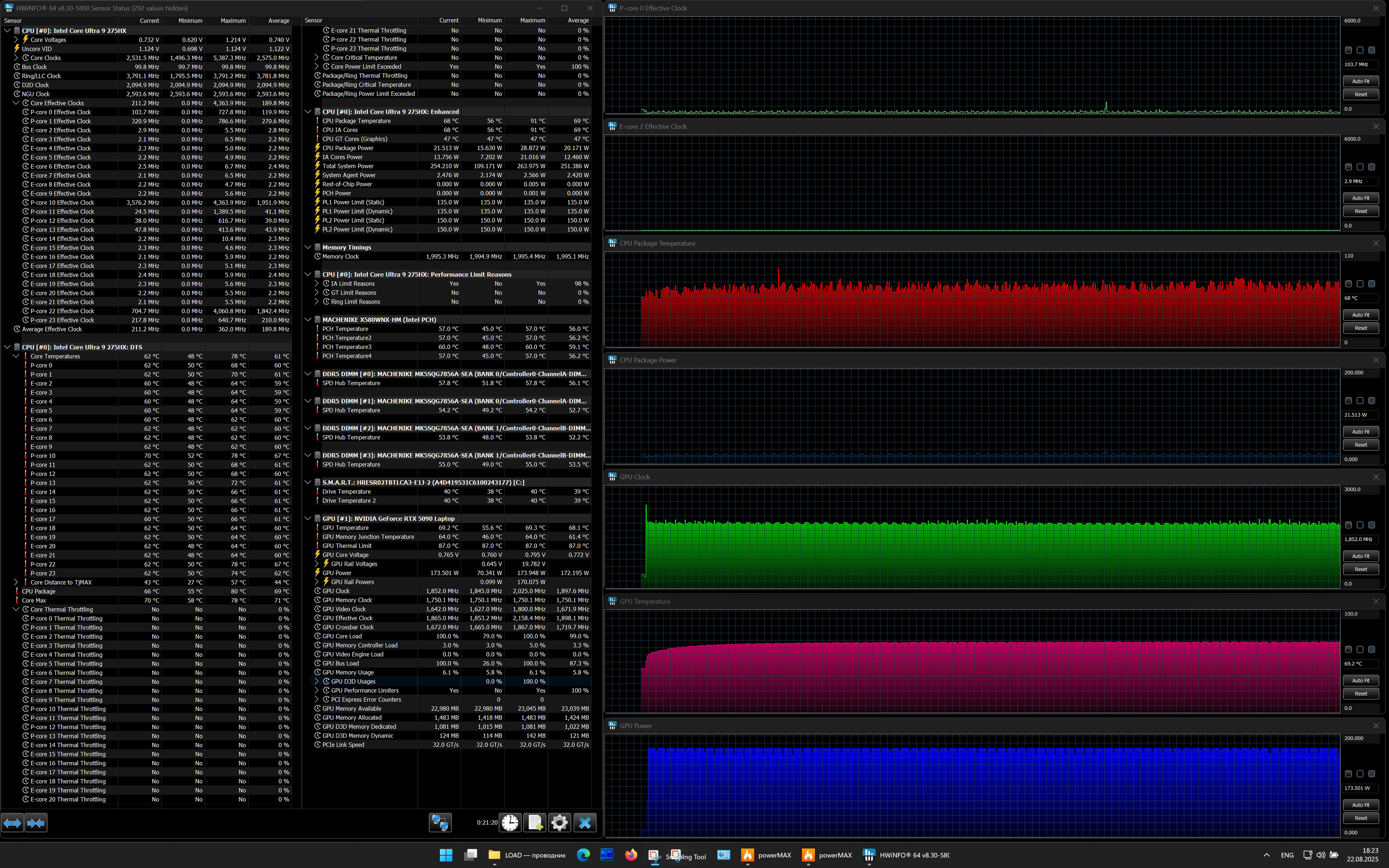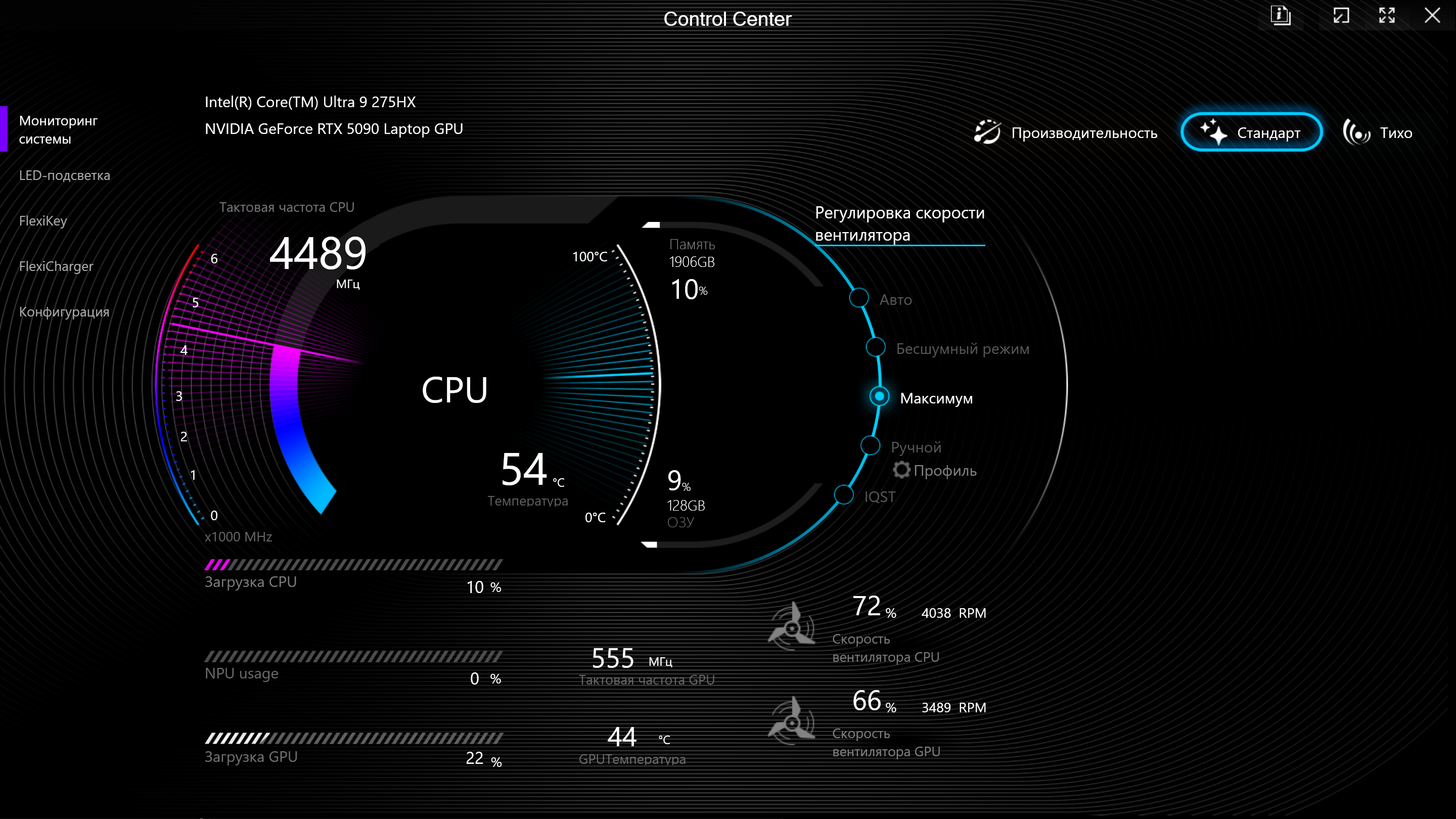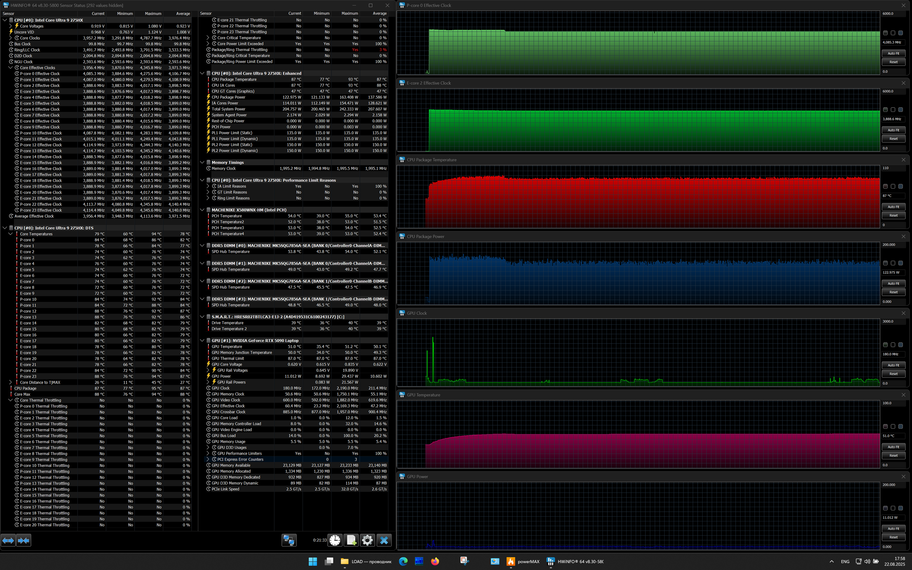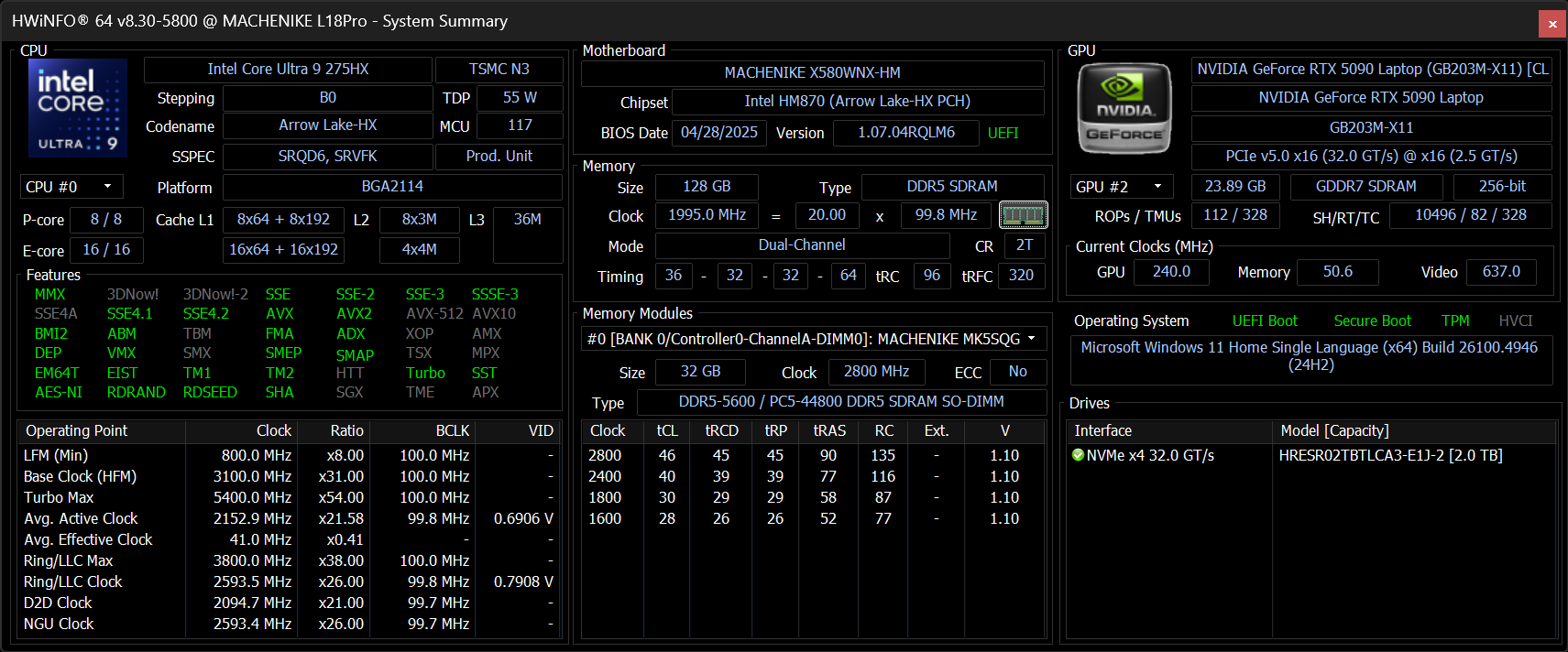 | Процессор | Intel Core Ultra 9 275HX: 8×P-ядер, 2,7/5,4 ГГц; 16×E-ядер; 2,1/4,6 ГГц; TDP 45—55/160 Вт, Tjmax 105 °C; Intel AI Boost NPU 13 TOPS | |