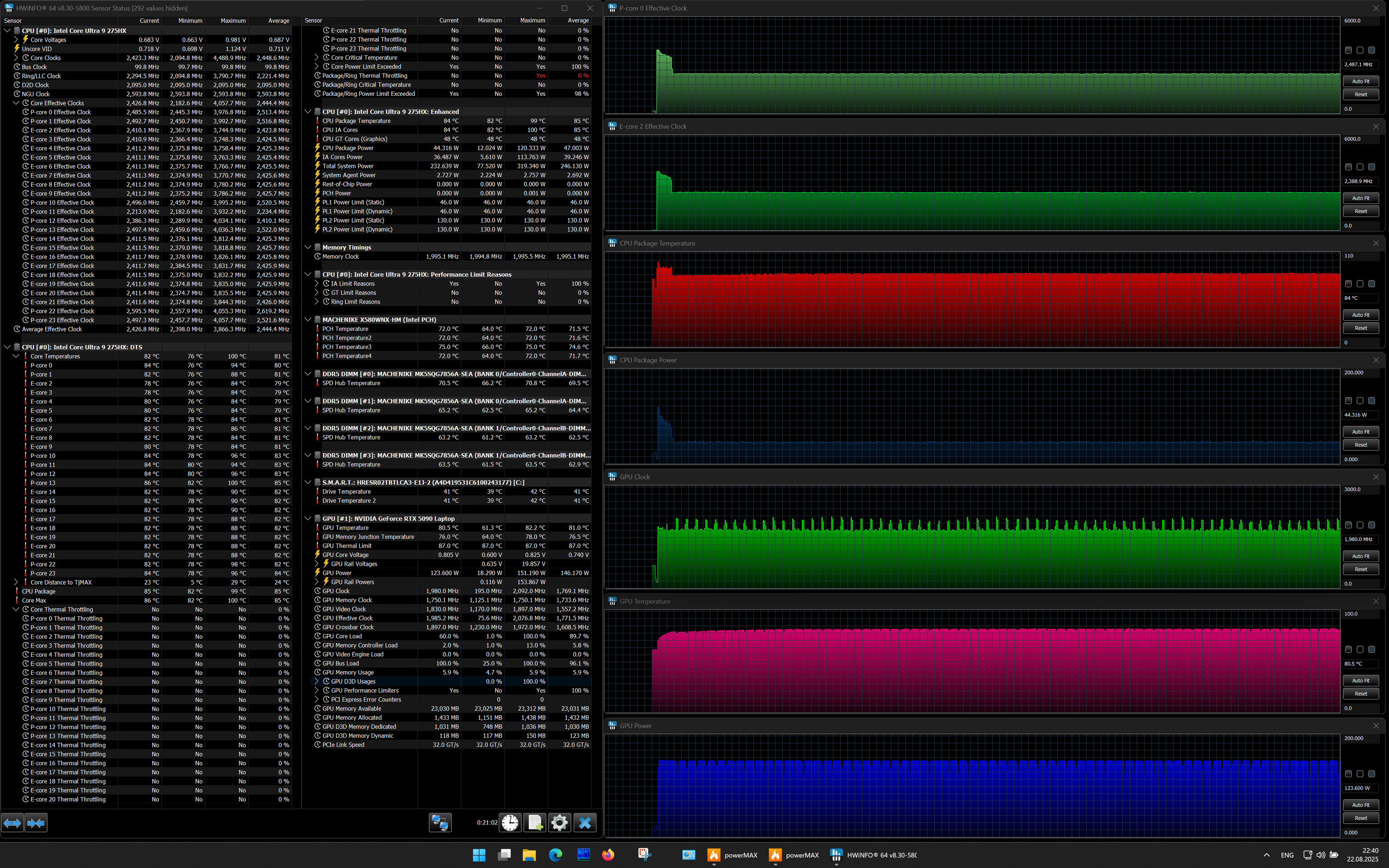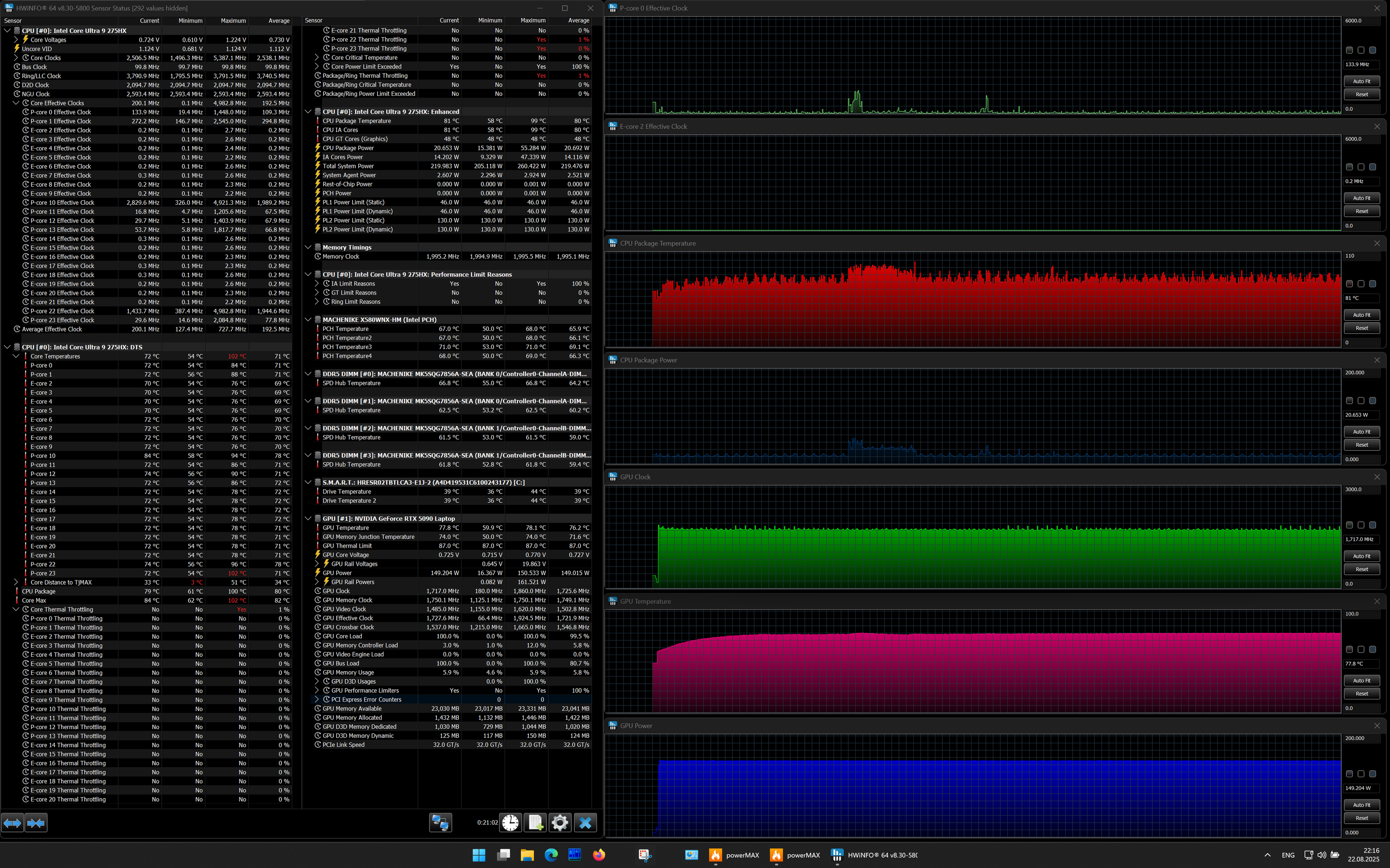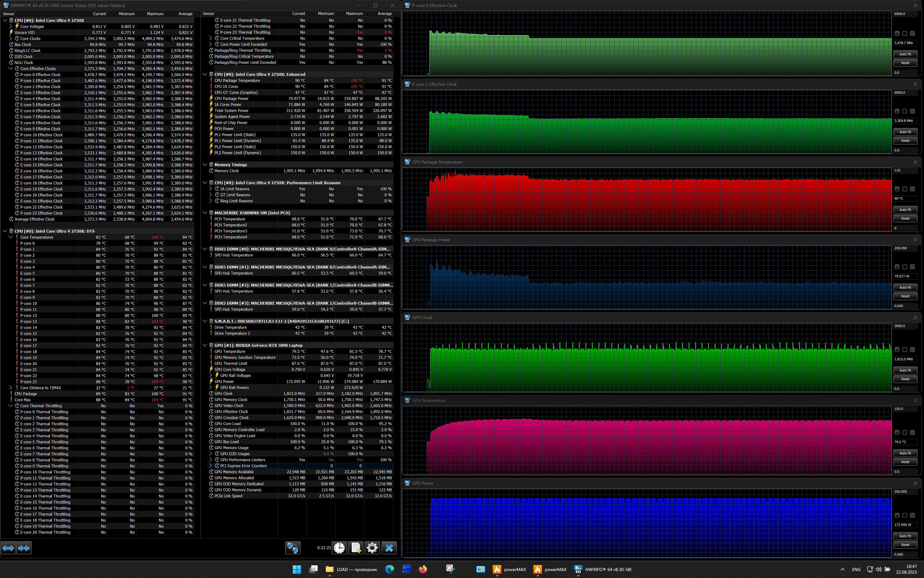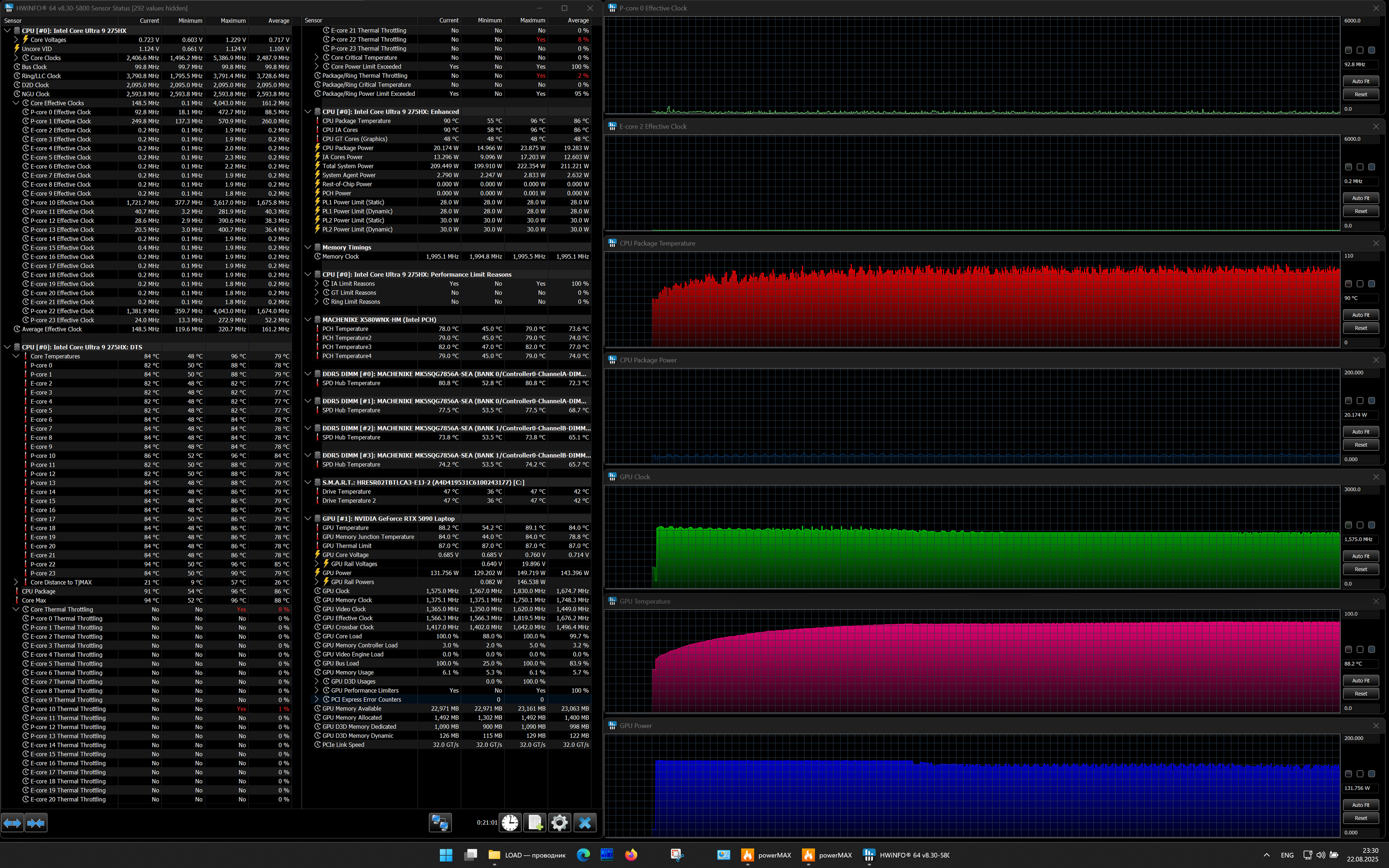 | Процессор | Intel Core Ultra 9 275HX: 8×P-ядер, 2,7/5,4 ГГц; 16×E-ядер; 2,1/4,6 ГГц; TDP 45—55/160 Вт, Tjmax 105 °C; Intel AI Boost NPU 13 TOPS | |