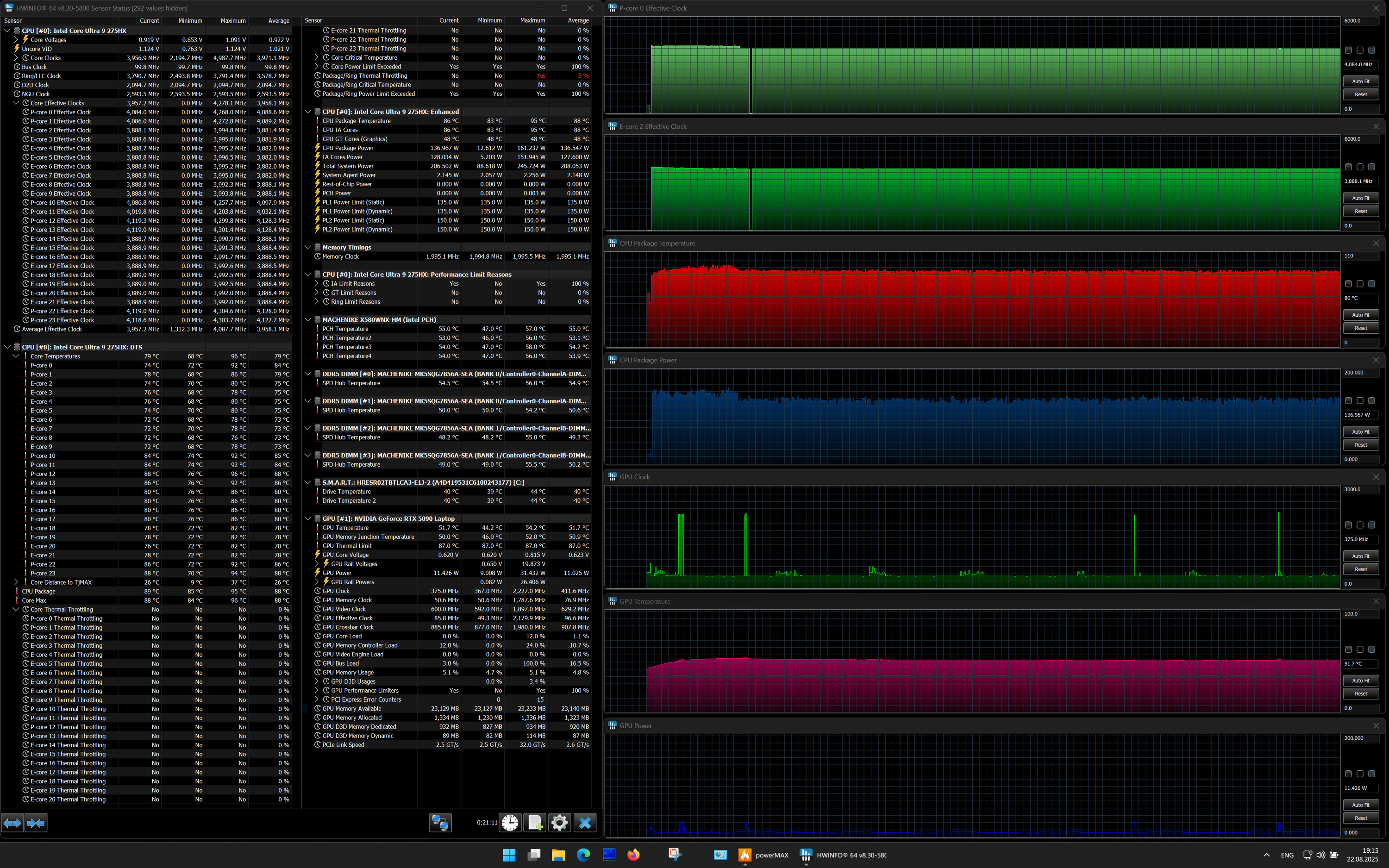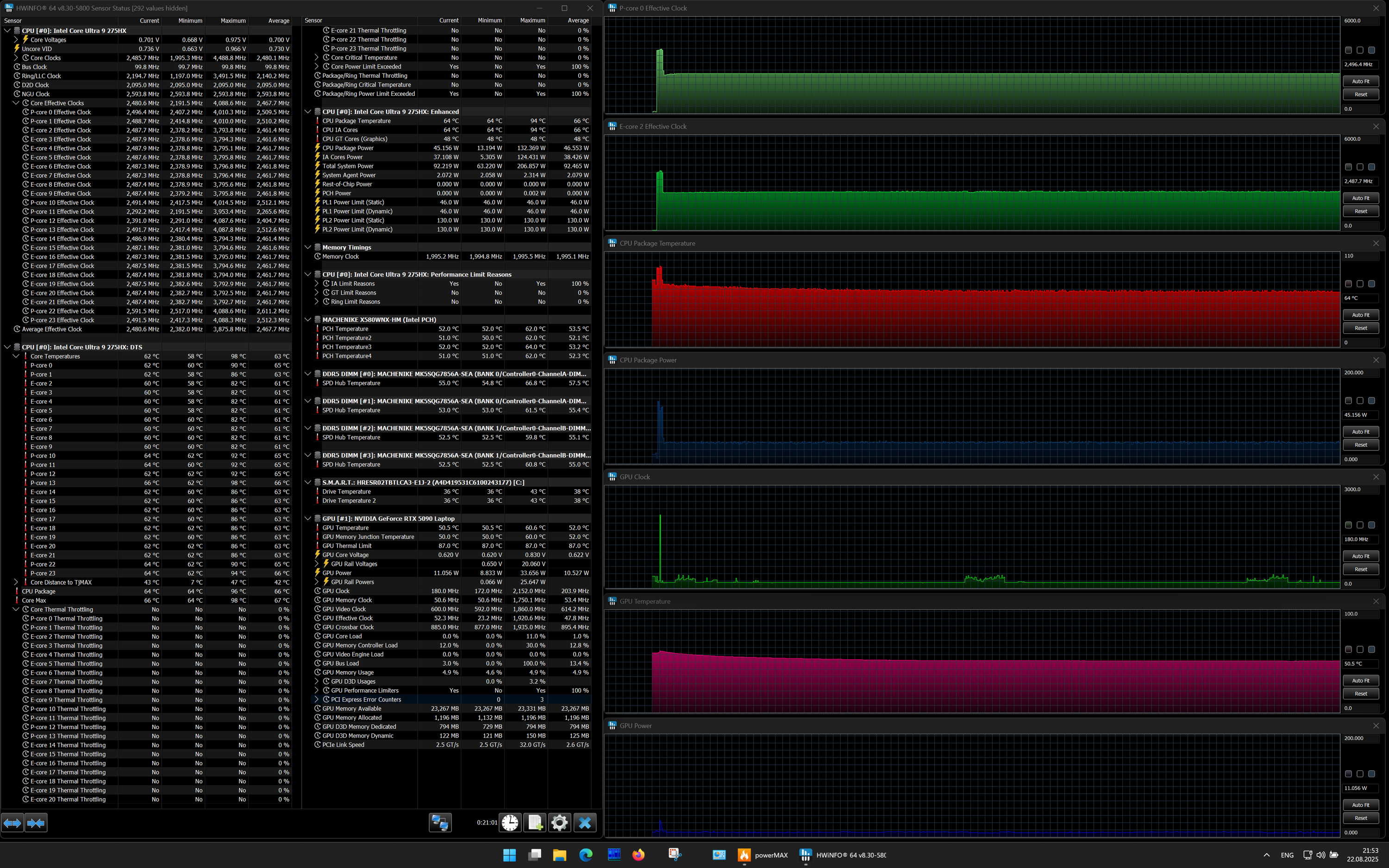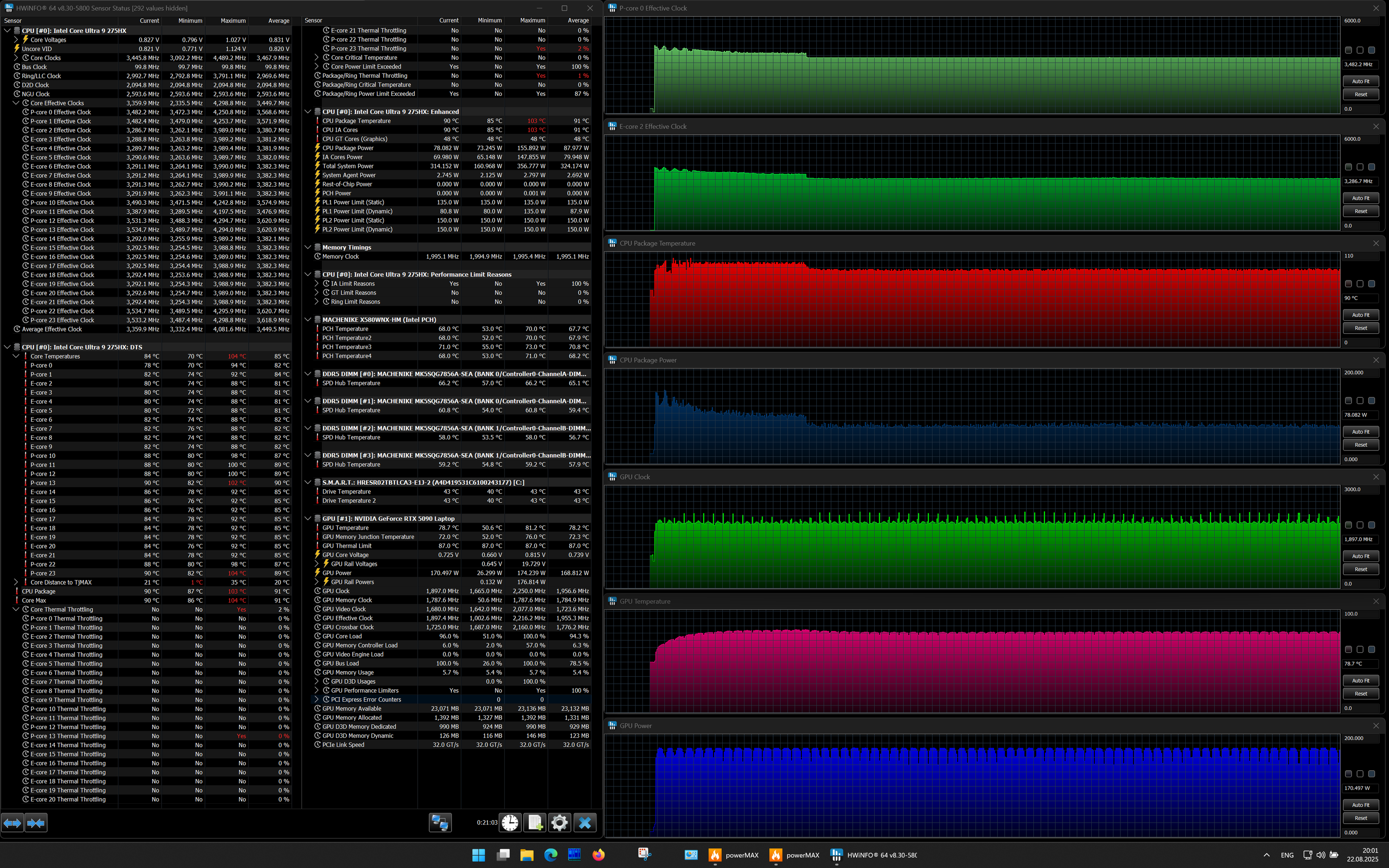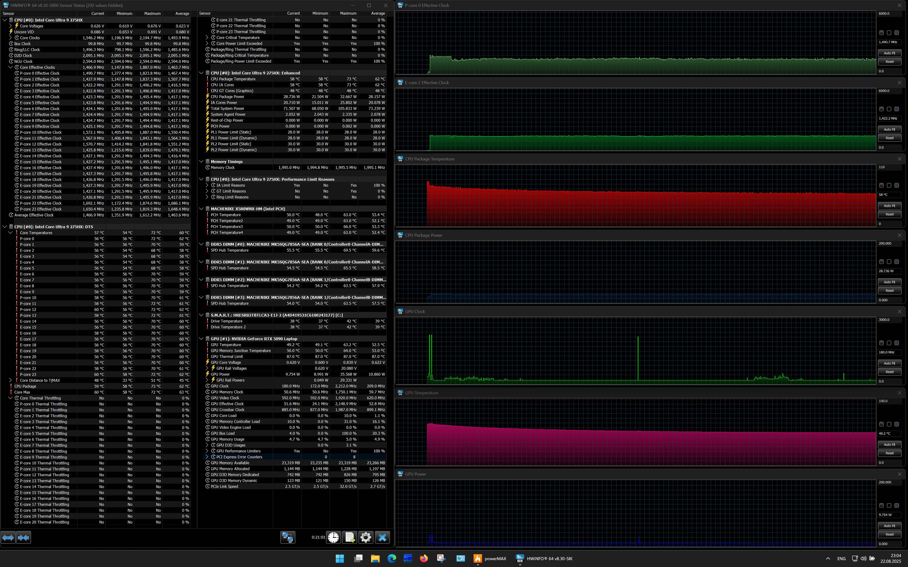 | Процессор | Intel Core Ultra 9 275HX: 8×P-ядер, 2,7/5,4 ГГц; 16×E-ядер; 2,1/4,6 ГГц; TDP 45—55/160 Вт, Tjmax 105 °C; Intel AI Boost NPU 13 TOPS | |