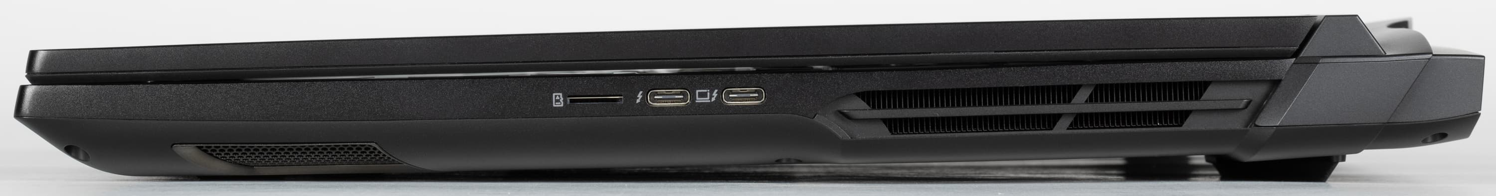 На правой боковой панели видны слот картовода для microSD и два порта Thunderbolt 4. Вывод видео осуществляется через тот, что справа, а PowerDelivery поддерживают оба этих разъема.