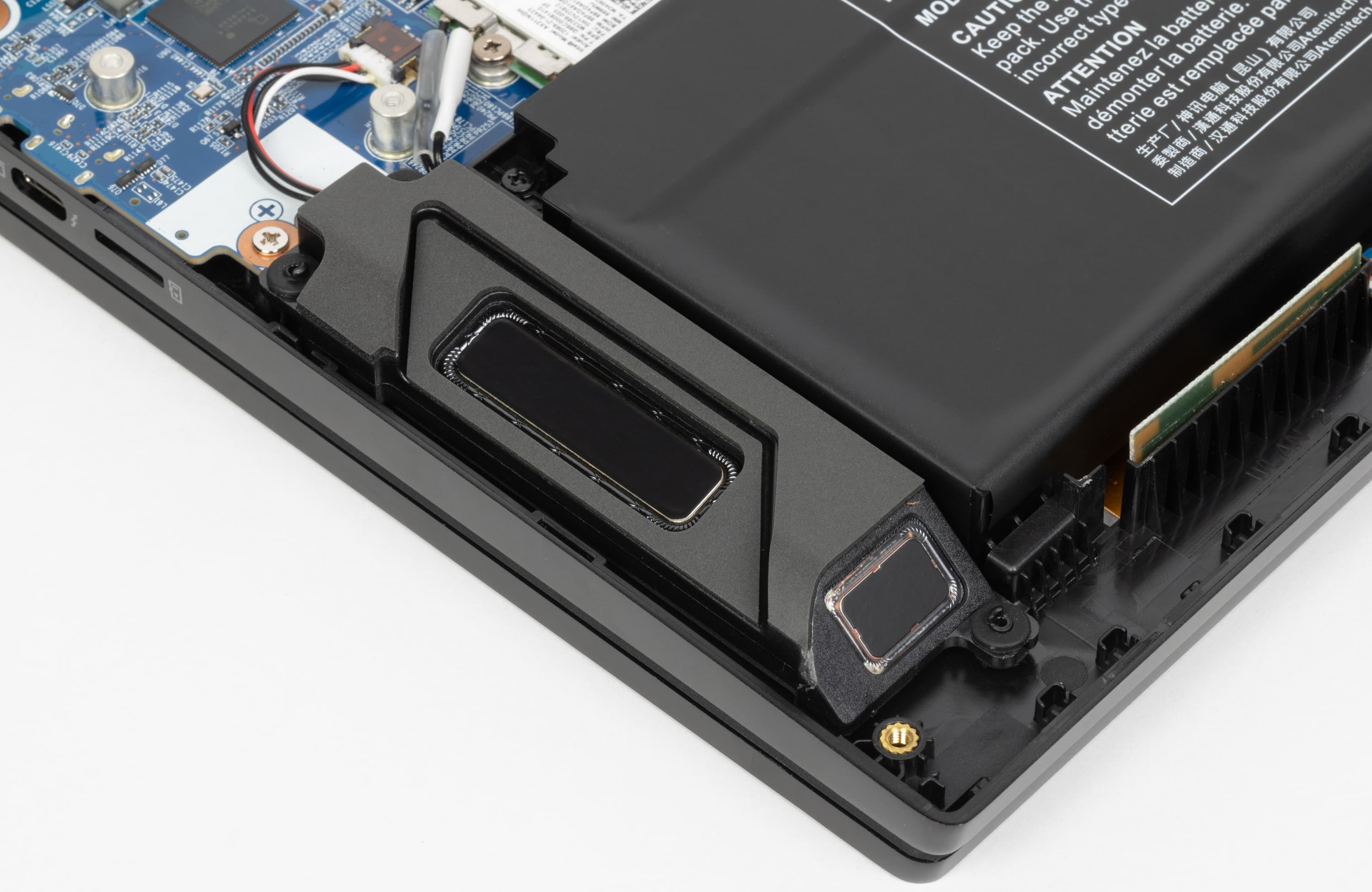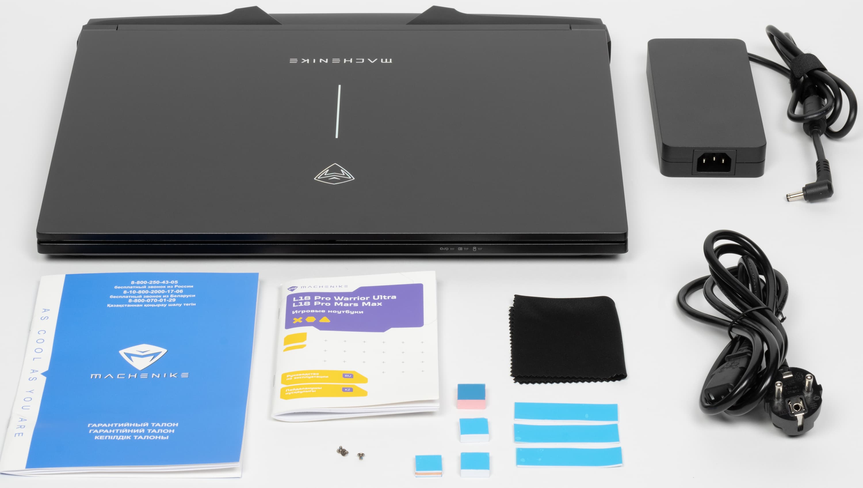 В комплекте поставки помимо самой машины, блока питания и традиционных бумажек входят термонаклейки для дополнительных SSD и салфетка из микрофибры (очевидно, для очистки экрана).
