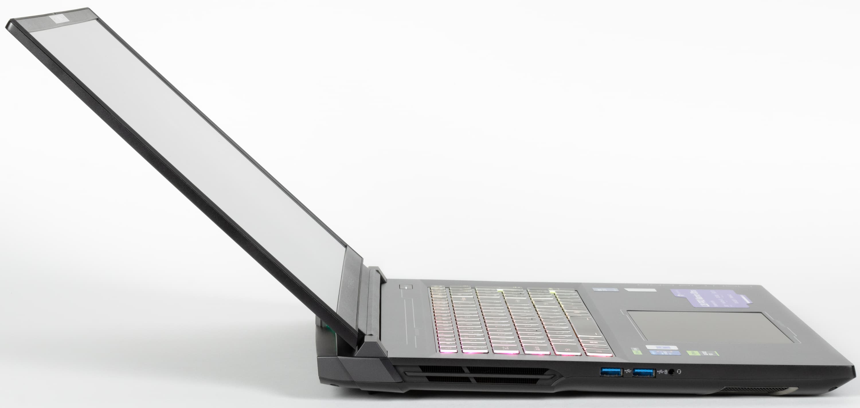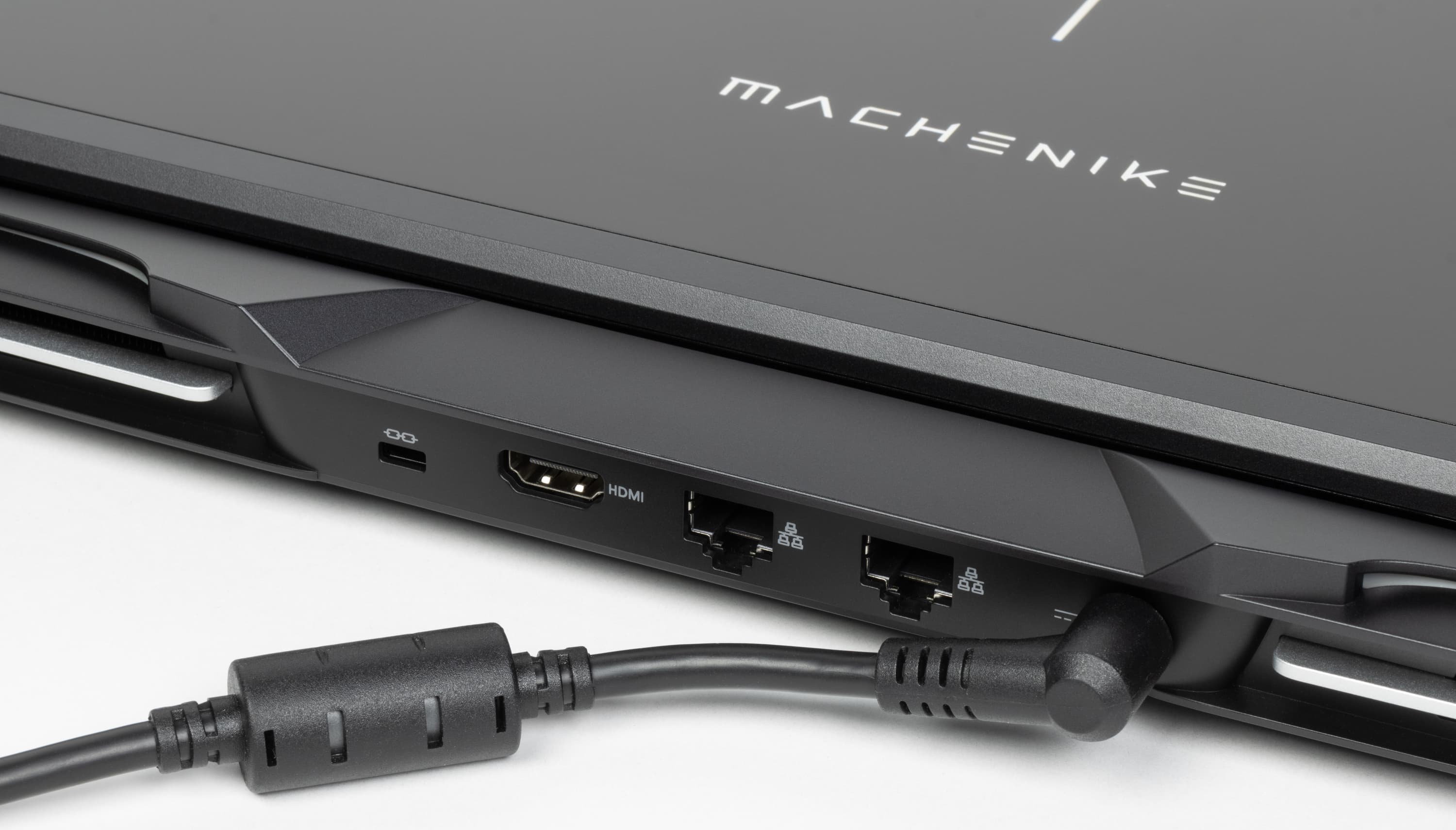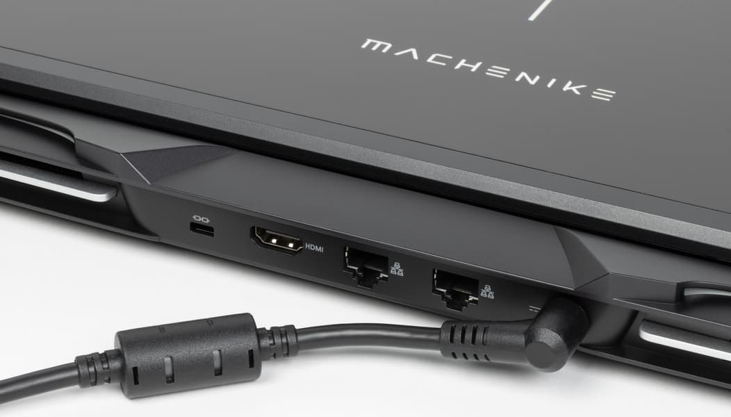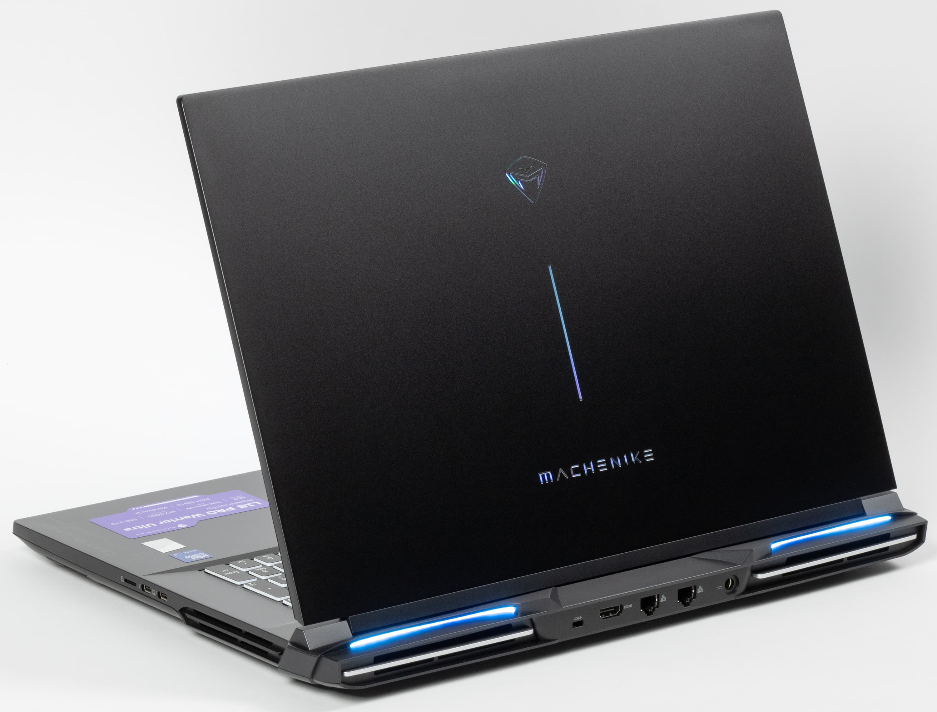 Оформление крышки довольно спокойное, лаконичное, приятное глазу. Логотип и надпись Machenike, а также вертикальная полоса между ними просто «хромированные», отверстия для выхода горячего воздуха подсвечиваются сообразно выбранной схеме подсветки клавиатуры. Тыльная поверхность маркая, легко собирает отпечатки пальцев и неохотно отдает их.