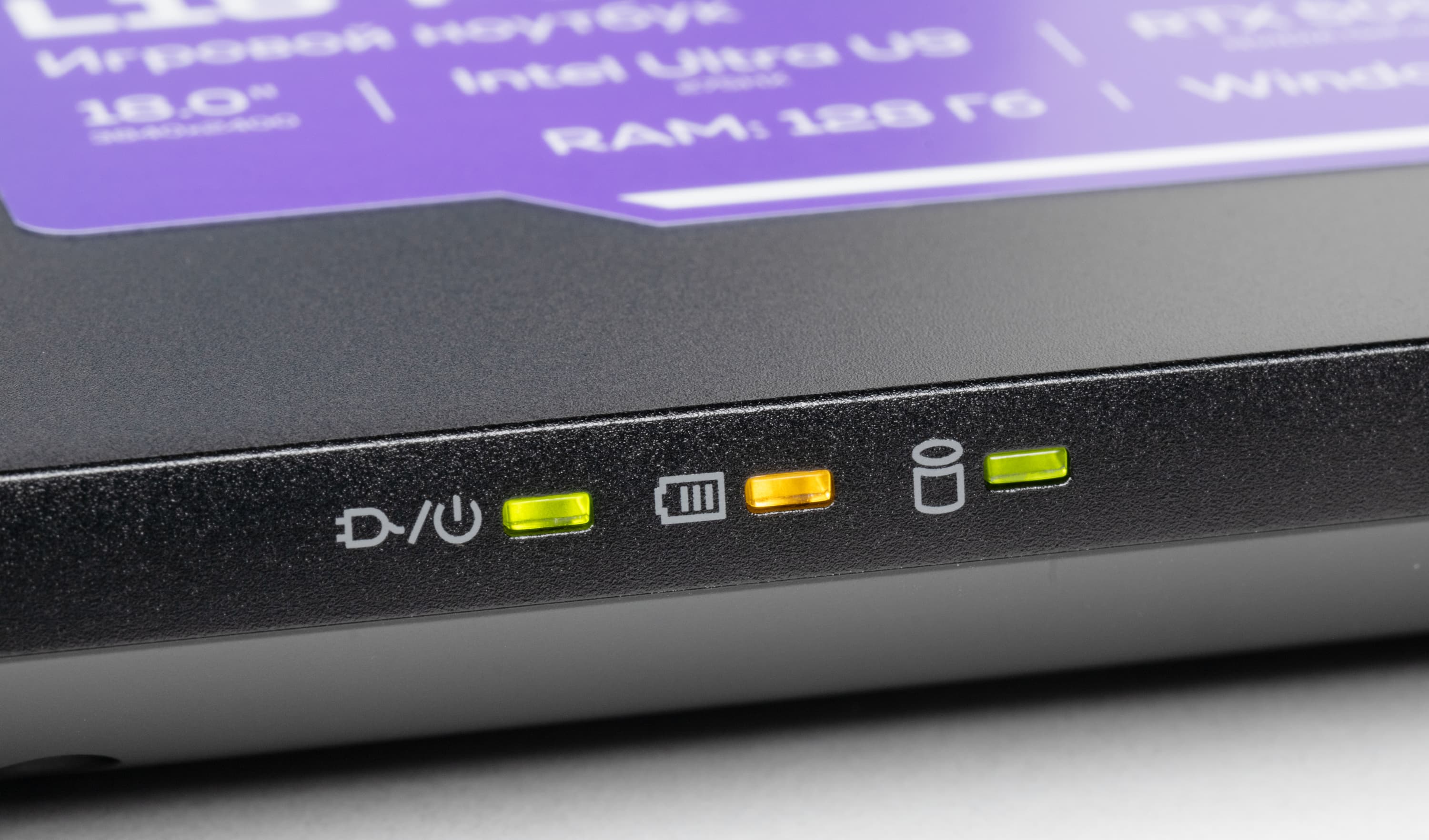 Левый светодиод сигнализирует о том, что ноутбук в работе или подключен к электрической сети, средний — о состоянии заряда батареи, левый показывает обращения к системному накопителю.