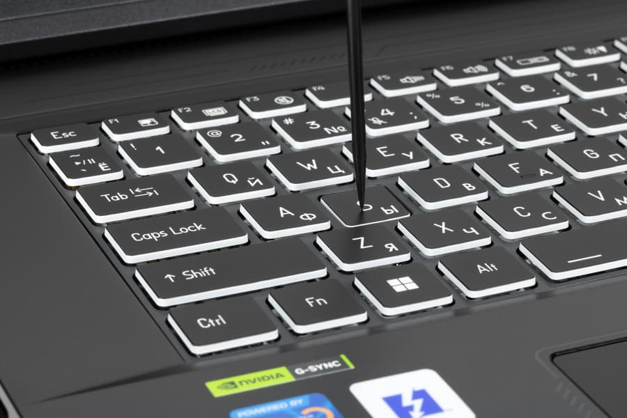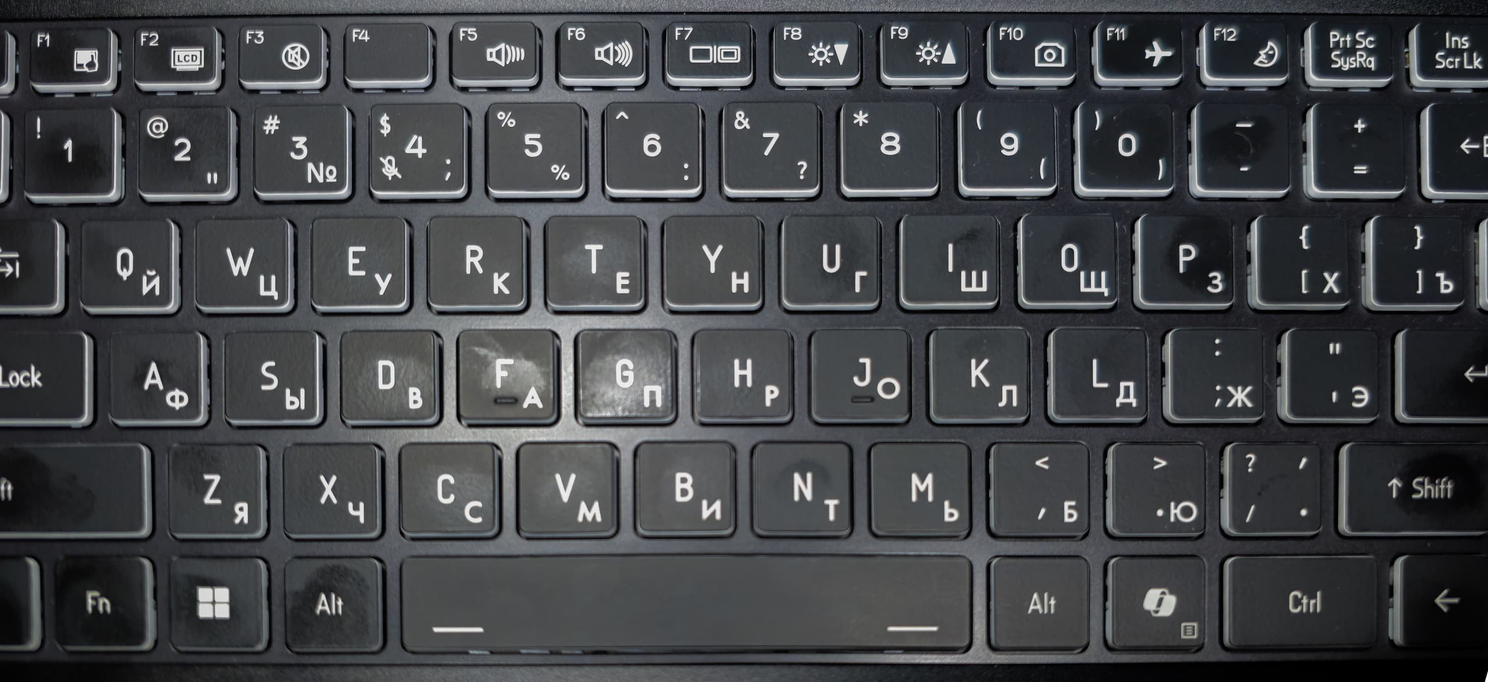 Пользователю предлагается полноразмерная клавиатура традиционного для ноутбуков мембранного типа. Обработка нажатий в ней осуществляется независимо (n-key rollover) — это означает, что система отреагирует на любое количество одновременно нажатых кнопок. Выделенных органов управления системными настройками нет. Клавиатура изначально рассчитана на единственную раскладку (американскую английскую), поэтому место для букв кириллицы (даже уменьшенных по сравнению с латинскими) нашлось лишь в нижних правых углах клавиш. С таким мы сталкивались, в частности, при неофициальной локализации. Когда же её делают на заводе, латинские и кириллические буквы чаще имеют одинаковые размеры и на равных делят клавиши. Почему-то в данном случае производитель в официальных поставках отдал приоритет латинице.