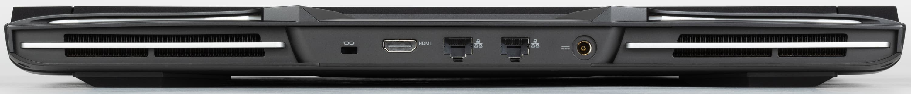Сзади справа и слева располагаются решетки выходных трактов системы охлаждения (СО), а между ними в ряд выстроились кенсингтонское крепление, видеовыход HDMI, две розетки RJ-45 для подключения к проводной локальной сети, а также коаксиальный разъем для кабеля адаптера питания.