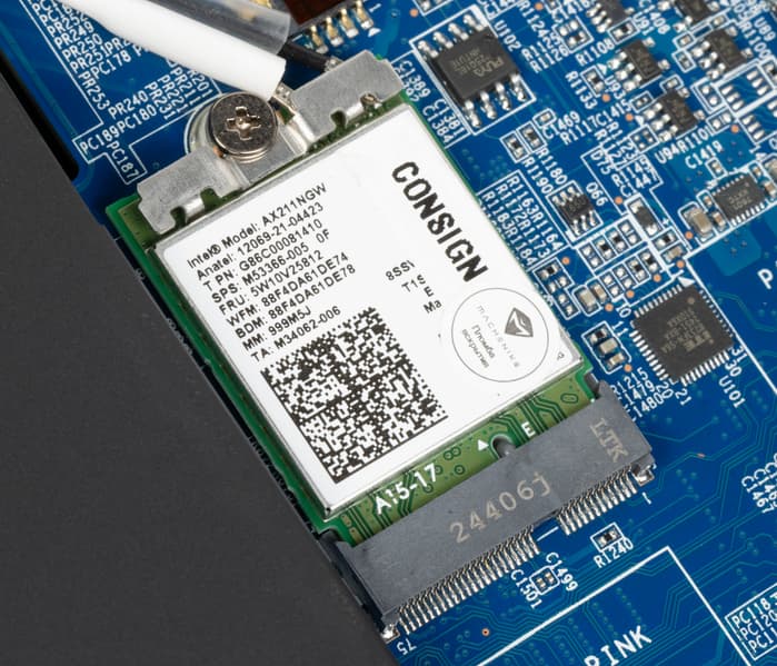 | Wi-Fi | Wi-Fi 6E, трехдиапазонный (2,4/5/6 ГГц) Intel AX211 (IEEE 802.11ax, 2×2 MIMO) | |