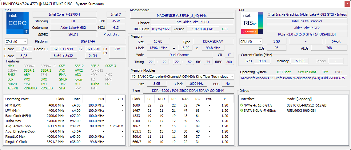 | Процессор | Intel Core i7-12700H (6+8 ядер/20 потоков, 2,7/4,7 ГГц, 45/115 Вт) | |