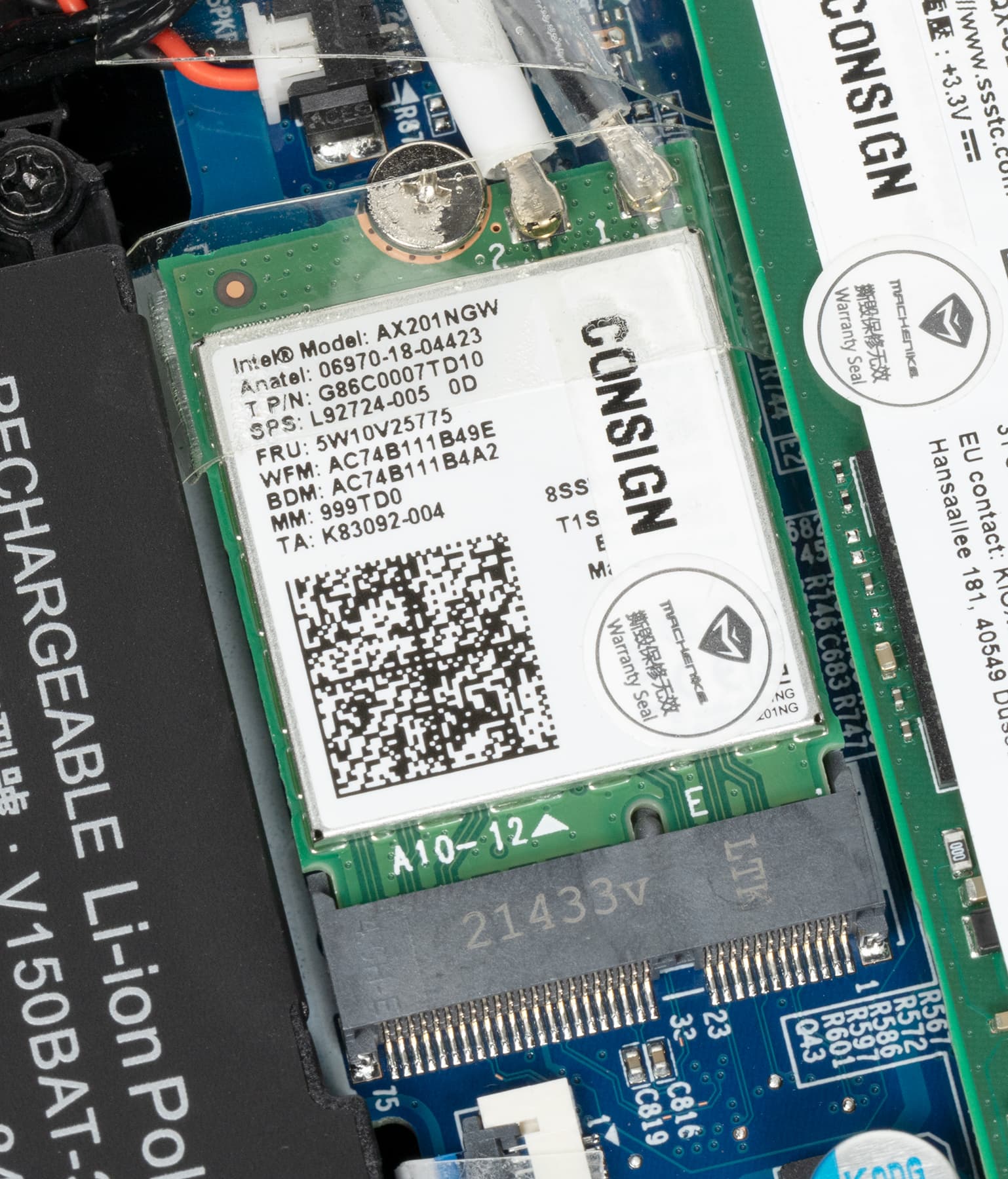 Рядом с занятым слотом для SSD-накопителя находится адаптер беспроводной связи Intel AX201NGW. Интересно, что оба компонента переданы производителю по договору комиссии (маркировка Consign).