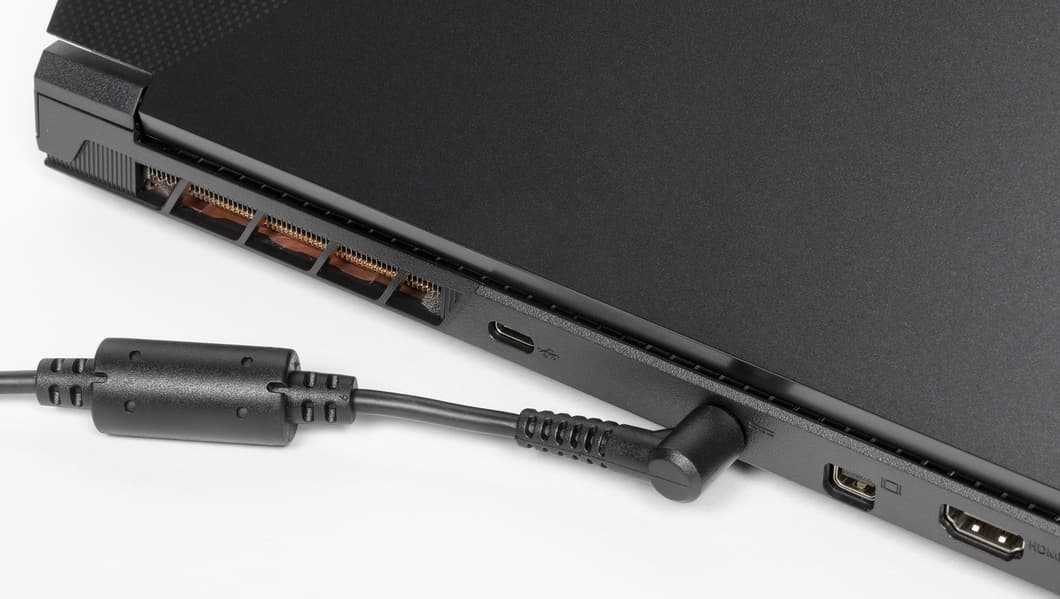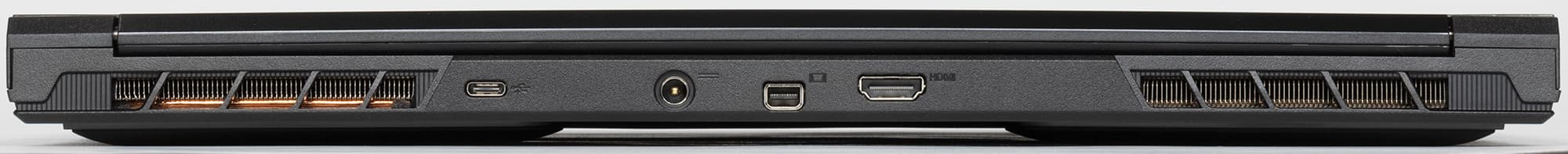 На задней панели заметны решетки выходных отверстий кулеров, через которые наружу выбрасывается горячий воздух, разъем USB Type-С, гнездо для подключения адаптера питания, коннекторы Mini-DisplayPort и HDMI.