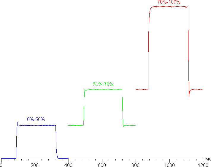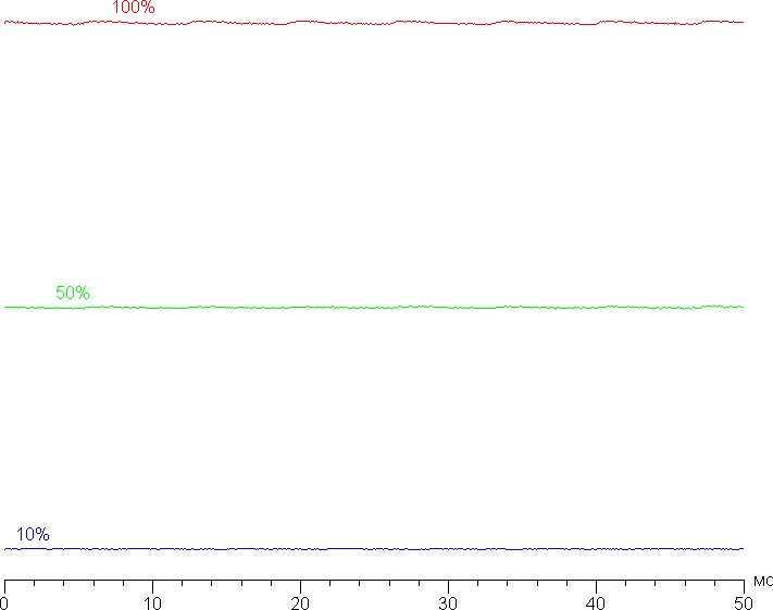 На любом уровне яркости значимая модуляция подсветки отсутствует, поэтому нет и никакого мерцания экрана. В доказательство приведем графики зависимости яркости (вертикальная ось) от времени (горизонтальная ось) при различных значениях настройки яркости: