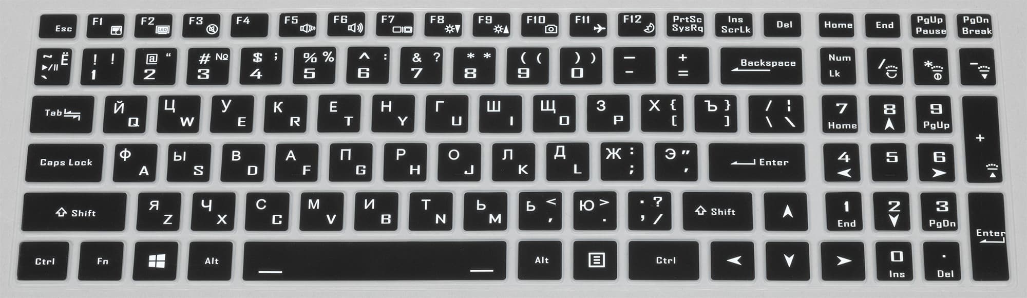 Для компенсации отсутствия маркировки клавиш символами кириллицы в упаковку положили защитную мембрану для клавиатуры, на которую нанесены символы нашего национального алфавита.
