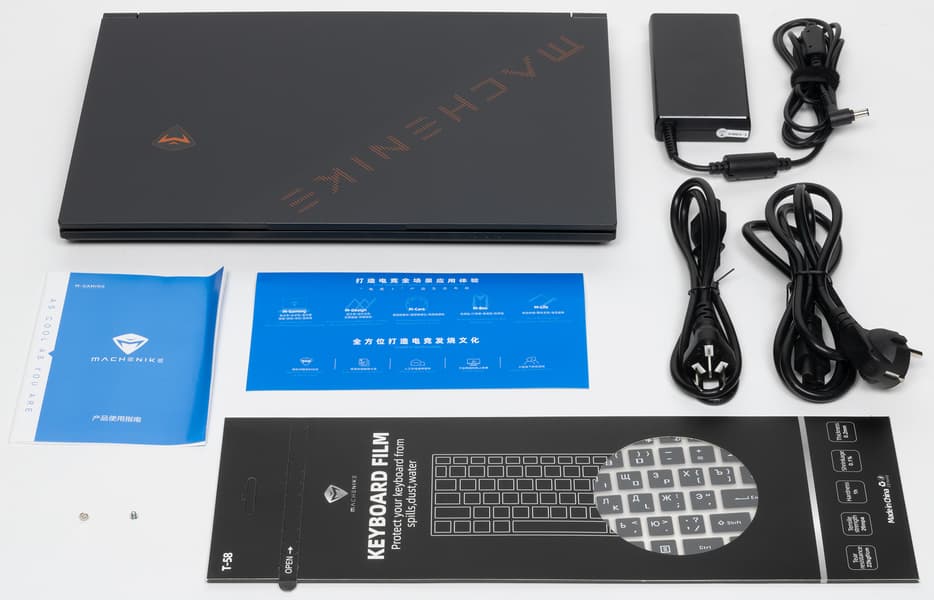 Помимо самой машины в комплекте поставки обнаруживаются адаптер питания, два кабель для его подключения к электрической сети (с европейской и китайской континентальной вилками), традиционные бумажки и накладная мембранная защита для клавиатуры, которая в нашем случае позволяет работать с кириллицей, поскольку на клавишах нанесены только латинские символы. Вероятно, это признак предпродажного образца, который мы получили для испытаний, и в серийных изделиях для России маркировка клавиатуры будет локализованной (тогда, скорее всего, на нашем рынке отпадет надобность и в кабеле питания с китайской вилкой).