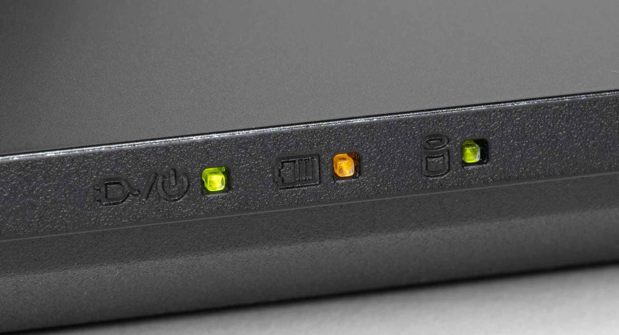 Светодиодные индикаторы, расположенные на передней панели справа, информируют о режиме питания от электрической сети, зарядке батареи и активности накопителя. При закрытой крышке все они хорошо видны.