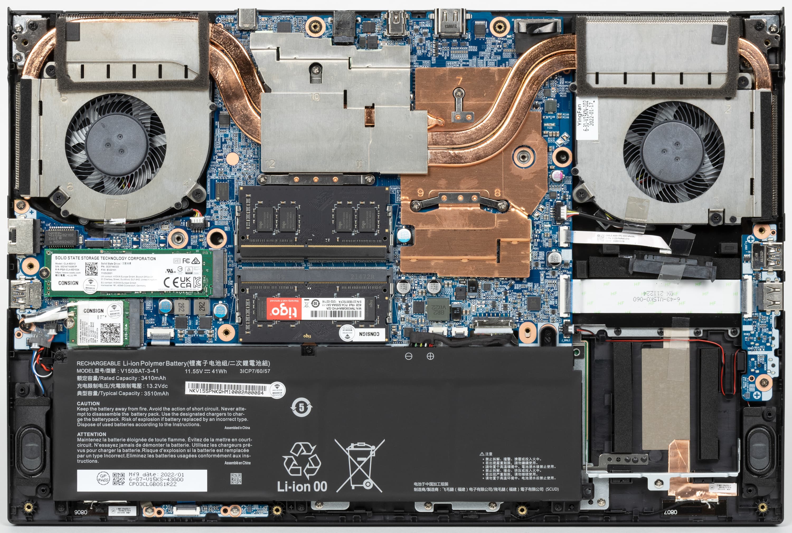 Открутив 14 крестовых винтов, крепящих днище к корпусу, получаем доступ к главным компонентам машины: кулерам, модулям оперативной памяти, SSD-накопителю и батарее.