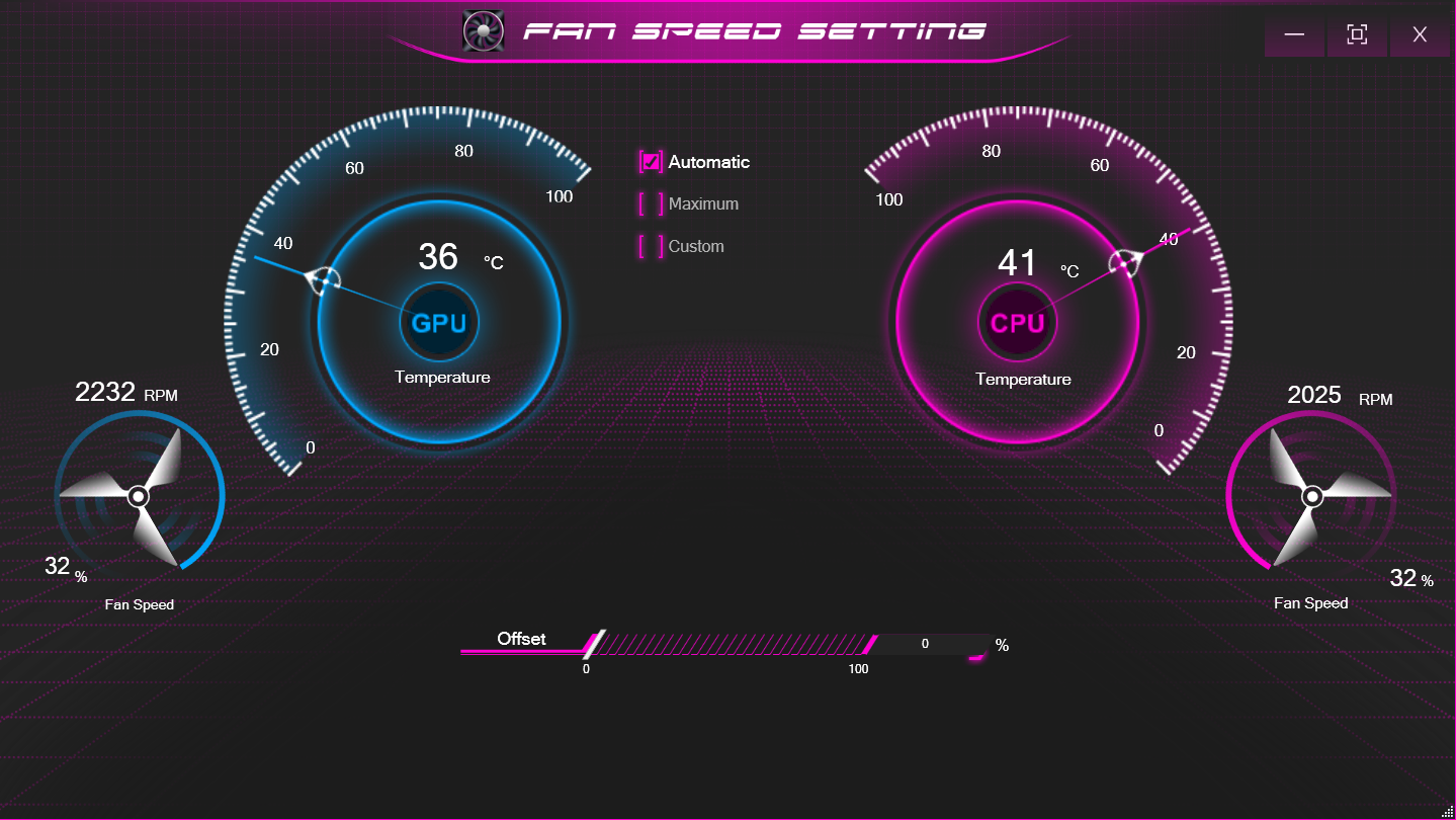 Fan Speed Control предоставляет возможность выбрать режим работы вентиляторов (автоматический, максимальная скорость или пользовательский) и демонстрирует текущие скорости их вращения.