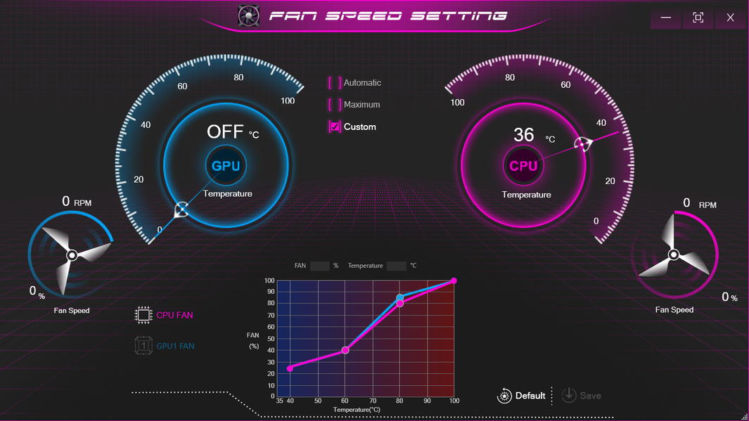 Пользовательский режим позволяет настраивать изменение скорости вращения кулеров с установками пороговых значений температуры обоих вычислителей.