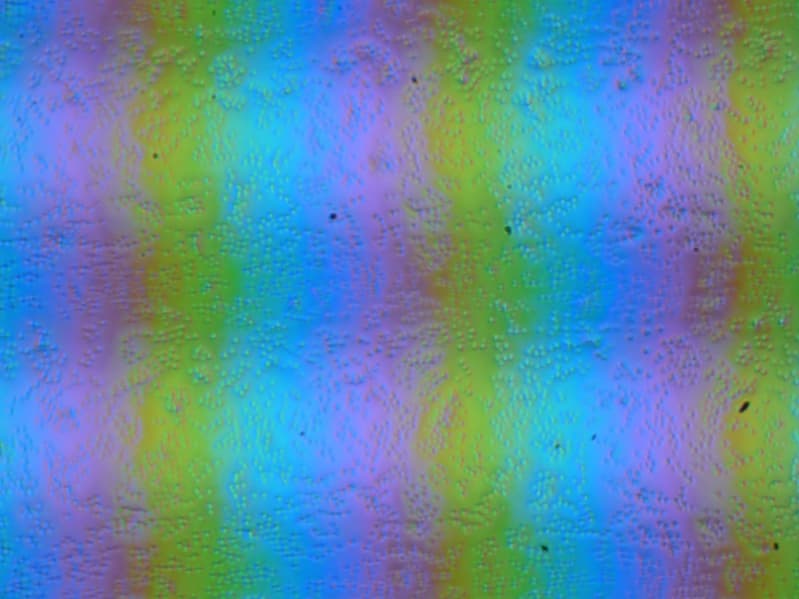 Зерно этих дефектов в несколько раз меньше размеров субпикселей (масштаб этих двух фотографий примерно одинаковый), поэтому фокусировка на микродефектах и «перескок» фокуса по субпикселям при изменении угла зрения выражены слабо, из-за этого нет и «кристаллического» эффекта.