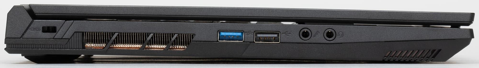 На левой боковой панели помещены кенсингтонский замок, решетка выходного отверстия системы охлаждения, разъемы USB 3.2 Gen2 и USB 2.0 Type-A, миниджеки 3,5 мм (вход внешнего микрофона и выход на наушники).