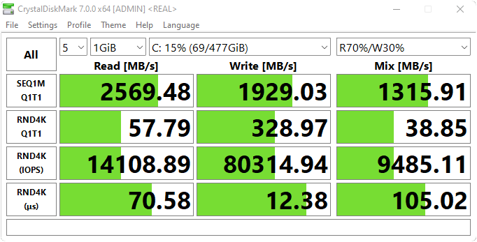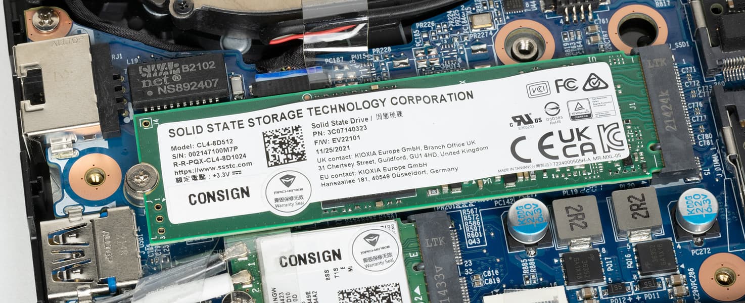 В ноутбуке установлен твердотельный накопитель Kioxia (SSST CL4-8D512) форм-фактора M.2 с трехуровневой организацией ячеек (TLC 3D NAND). Он обладает скоростями последовательных чтения/записи 3500/2100 МБ/с и предоставляет пользователю неформатированную емкость 512 ГБ (после развертывания операционной системы и программных утилит свободно около 480 ГБ).