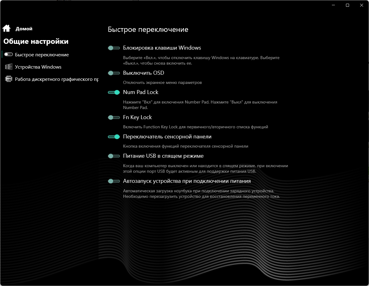 Фирменная утилита позволит контролировать состояние ноутбука, менять некоторые параметры и режимы, управлять эффектами подсветки.