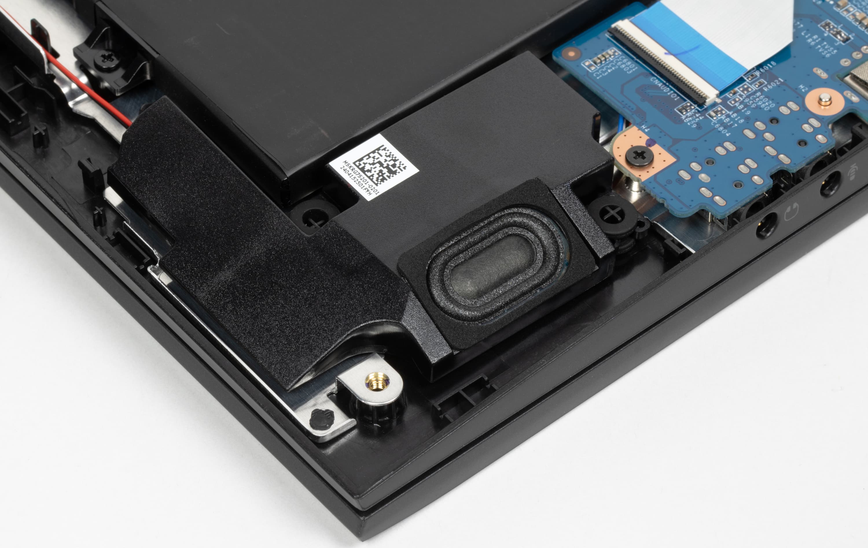 Батарея, состоящая из трех ячеек, занимает не всю ширину корпуса, оставляя по бокам лишь немного места для динамиков. Ее емкость небольшая — 46,74 Вт·ч, хотя вполне можно было поместить батарею с четырьмя ячейками и более высокой емкостью; конечно, при этом неизбежно увеличился бы вес ноутбука, но он и без того далеко не сверхмалый.
