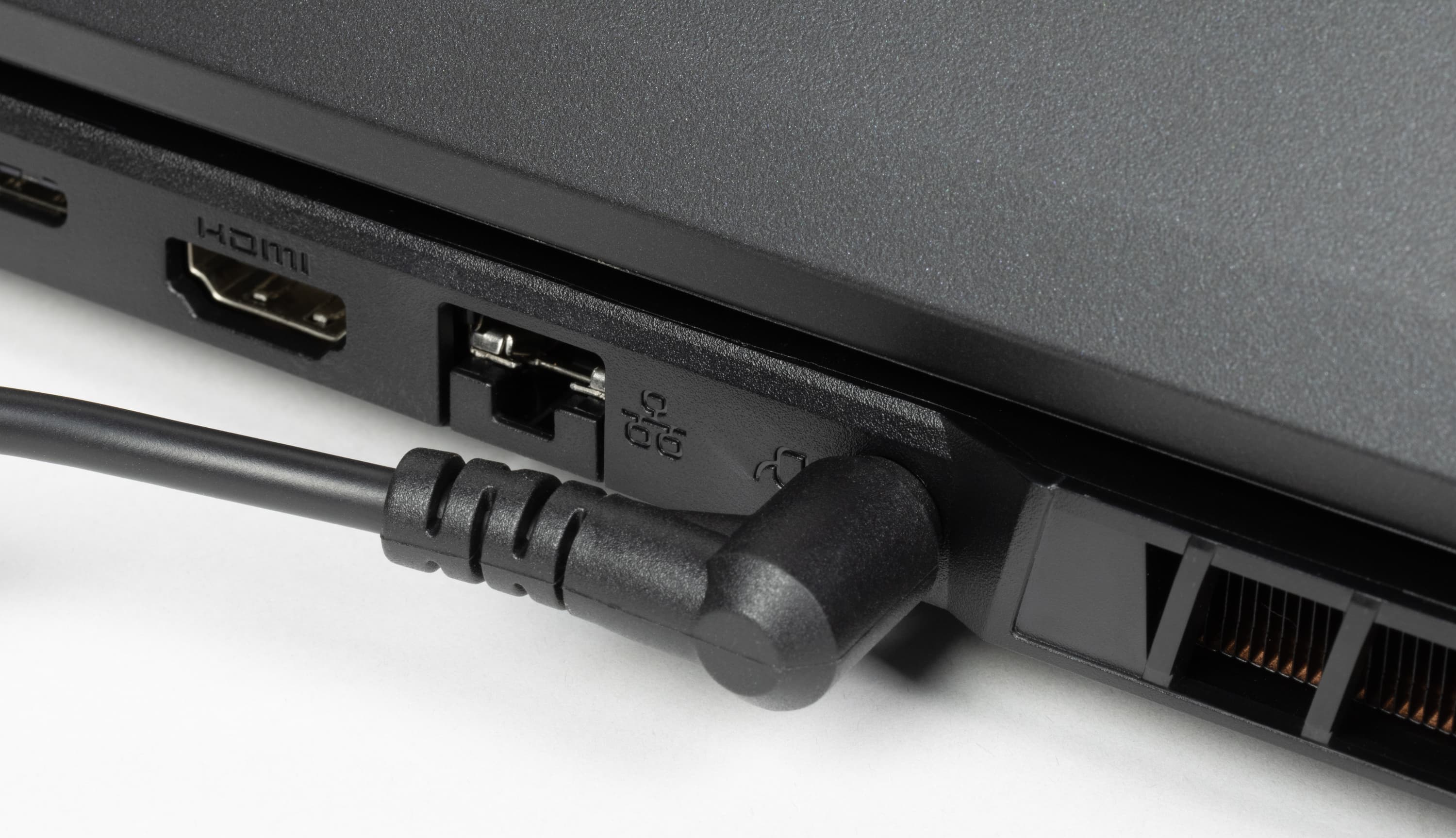Сзади расположились разъемы, к которым обычно подключаются редко, но надолго: RJ-45 (с откидной шторкой) для подключения к проводной сети, полноразмерный HDMI, Mini-DisplayPort и гнездо для подключения штатного блока питания. Там же находится и порт USB 3.2 Gen2 Type-С, а вот его хотелось бы видеть сбоку, чтобы доступ к нему был удобнее, особенно если учесть, что он может использоваться лишь для обмена данными, но не для вывода видеосигнала или питания от PD-адаптера.