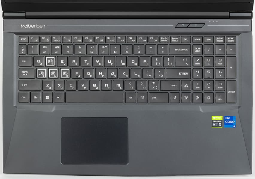 Клавиатура мембранного типа, полноразмерная. Обработка нажатий осуществляется независимо (on-key rollover). Это означает, что система отреагирует на любое количество одновременно нажатых кнопок. Вертикальный ход последних составляет почти 2 мм, но тактильный отклик отчетливый, и особой специфики не чувствуется. По сравнению с десктопным вариантом изменения в раскладке имеются, но они непринципиальные.