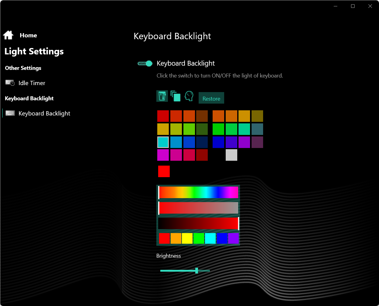 Клавиатура снабжена подсветкой с тремя уровнями по яркости (четвертое состояние — выключена). Переключение производится повторными нажатиями аккордов Fn и F7. Подсвечиваются сами символы на клавишах и их контуры. Зона подсветки под каждой клавишей хорошо видна при отклонении от клавиатуры. По интенсивности она явно превосходит яркость символов на клавишах. Распределение света не позволяет четко видеть символы русской раскладки. Есть возможность переключения цветов, но не для каждой клавиши, а для всех вместе. Подсветка с переливами поддерживается только для смены цвета всей клавиатуры.