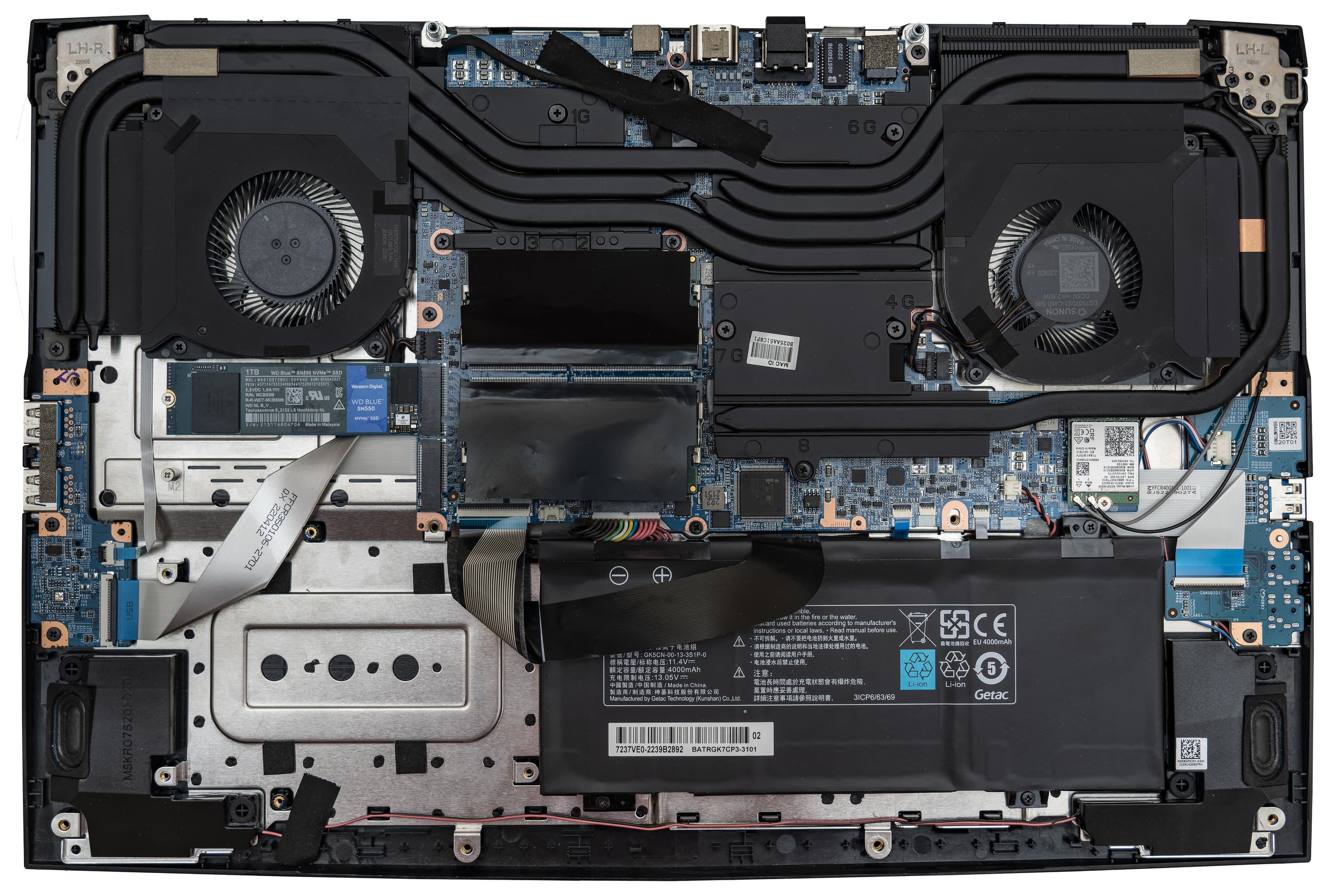 Здесь довольно много свободного места. Наибольший объем занимает отнюдь не батарея, а компоненты системы охлаждения ноутбука.