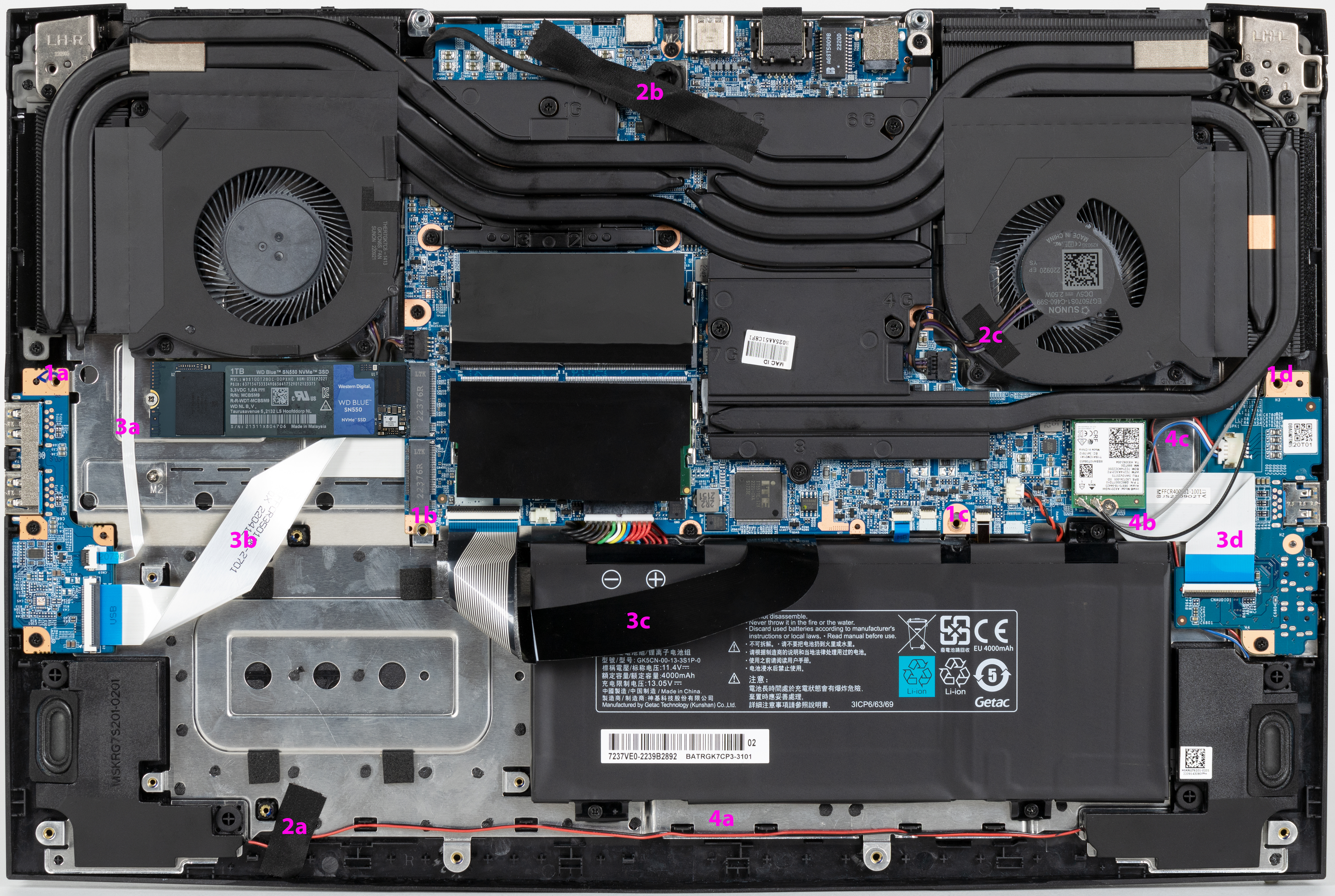 - Антенна беспроводного адаптера (4b) и провода, идущие от аудиоразъемов (4c) к системной плате, не закреплены и пересекаются друг с другом.