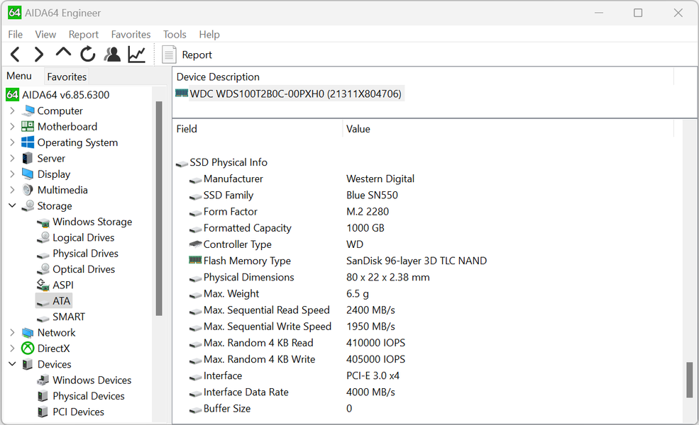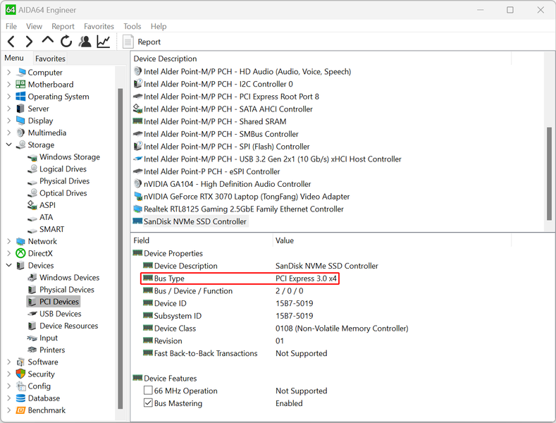 В принципе, на материнской плате реализована шина PCIe 4, но как видно из отчета Aida64, контроллер накопителя подключен к PCIe 3.0 x 4.