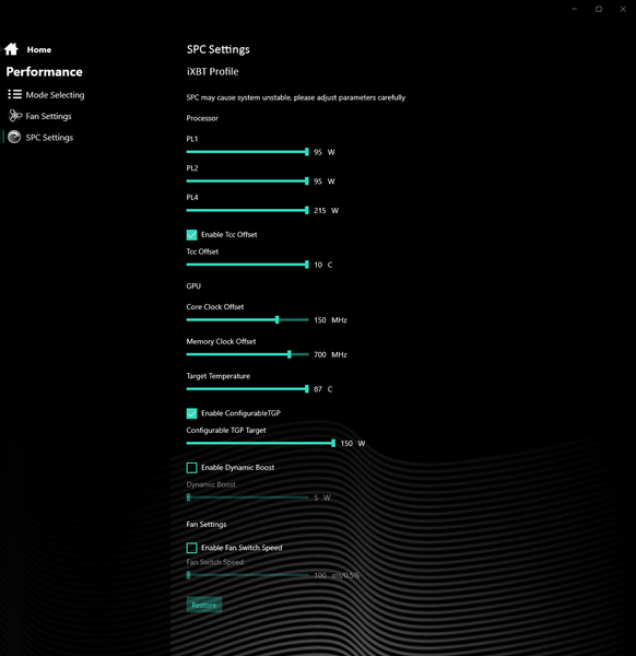 Фирменная утилита дает возможность управлять разгоном центрального процессора и дискретной графики. Это редкость в среде конкурирующих моделей аналогичного класса, позволяющая заметно повысить быстродействие обоих вычислителей в реальных приложениях и играх. Благодаря возможностям разгона ноутбук демонстрирует весьма хорошую производительность в бенчмарках игр нашего стандартного набора, одерживая верх не только над наиболее близким аналогом (MSI Katana GF76), но и над машиной с видеокартой и процессором, стоящими на ступень выше (Lyambda LLT173M01). Причем соответствие стандарту 60/30 (средних/минимальных) fps обеспечивается в подавляющем большинстве случаев даже при нативном разрешении экрана 2560×1440, не говоря уже о привычном Full HD.