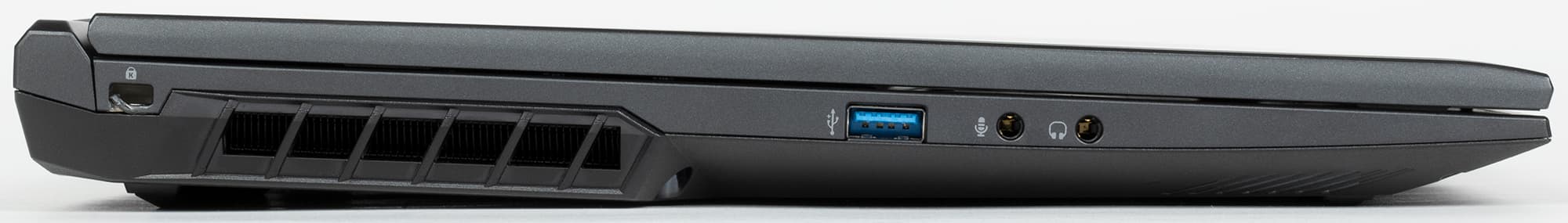 На левой боковой панели имеются отвестие кенсингтонского замка, решетка выходного отверстия системы охлаждения, разъем USB Type A, входной разъем для микрофона и аудиовыход на наушники (миниджеки 3,5 мм).