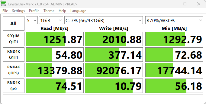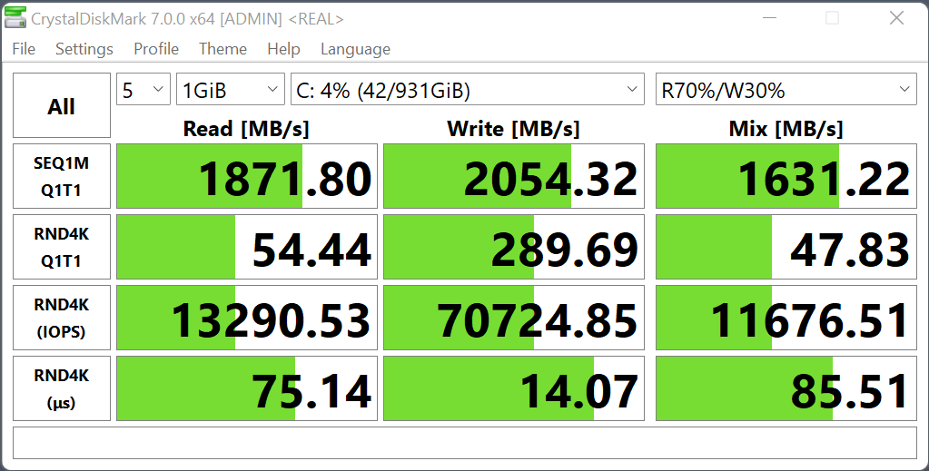 Скорости чтения/записи — 2400/1950 МБ/с. Неформатированная емкость составляет 1000 ГБ, в рабочей конфигурации со служебными разделами доступное пользователю пространство уменьшается до 870 ГБ, а после установки Windows 11 с драйверами и дополнительными приложениями оно сокращается еще на 40—50 ГБ.