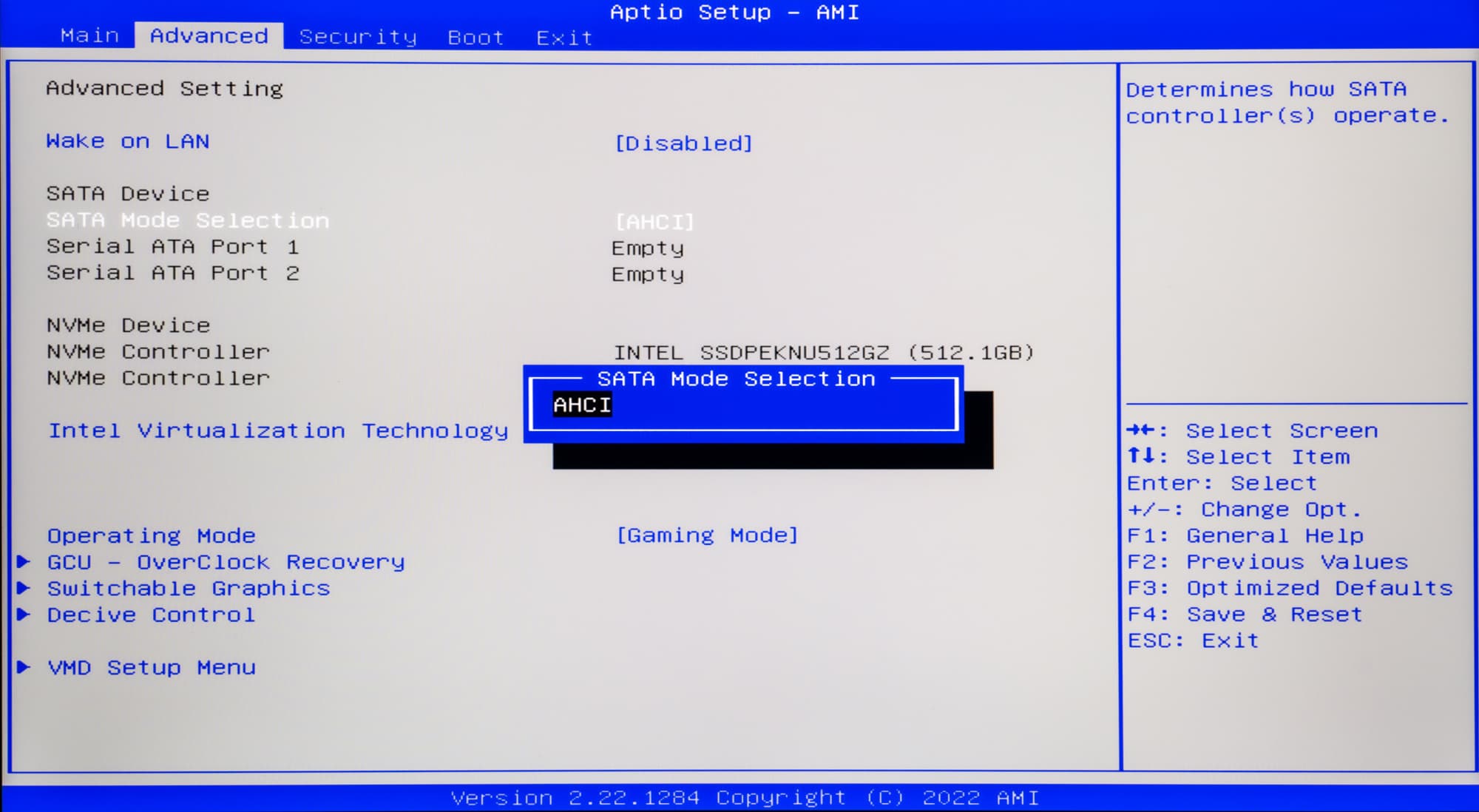 Вторым после Wake on LAN (пробуждение по локальной сети) фигурирует установка режима работы накопителей SATA. Здесь доступен только режим AHCI (Advanced Host Controller Interface), а встречавшаяся ранее эмуляция IDE (Integrated Device Electronics) не реализована. Ниже нашлось место для SSD-накопителей с интерфейсом NVMe (Non-Volatile Memory express). Правда, поменять здесь ничего нельзя, но можно видеть, какие модели установлены в первом и втором слотах.