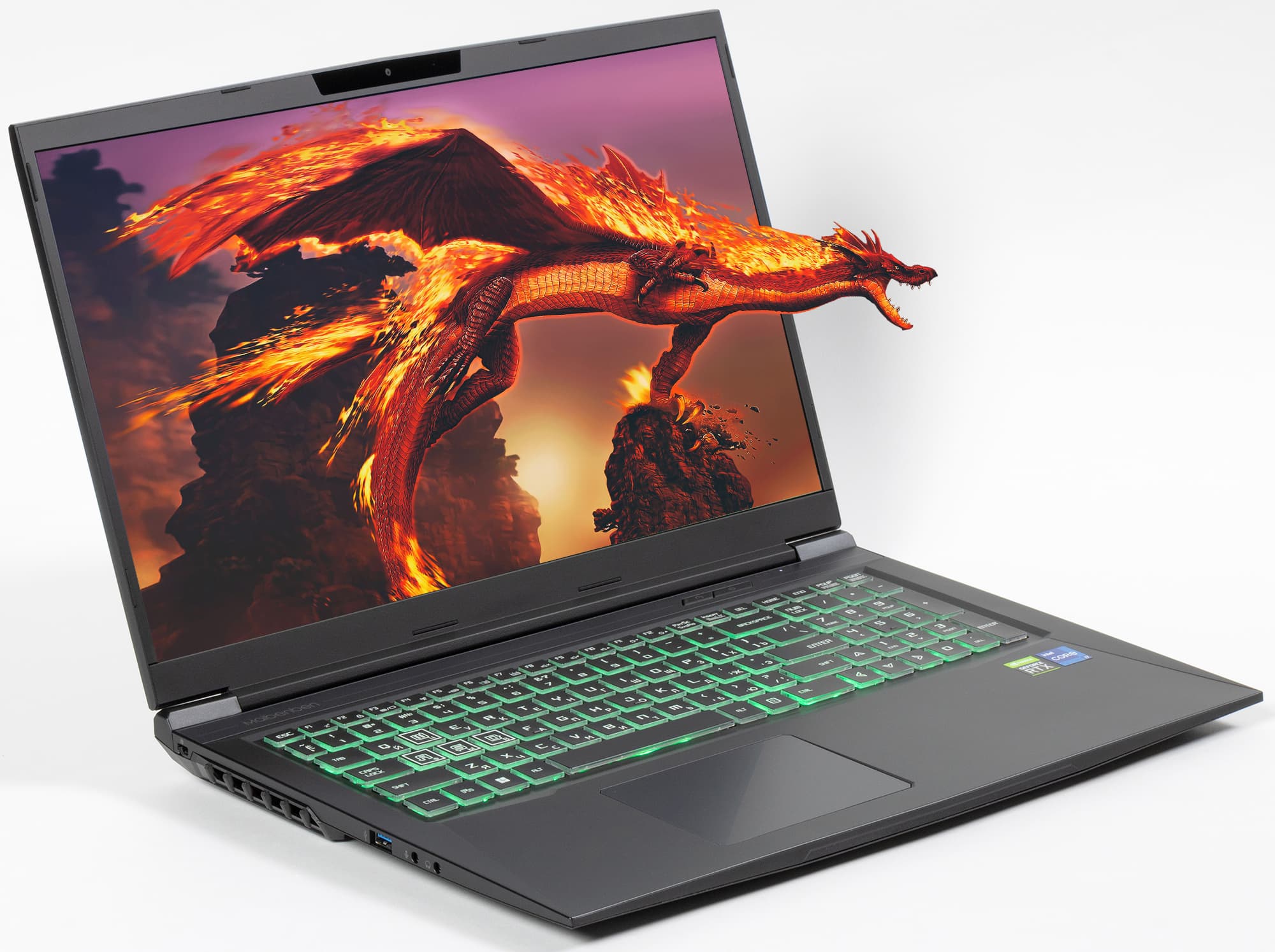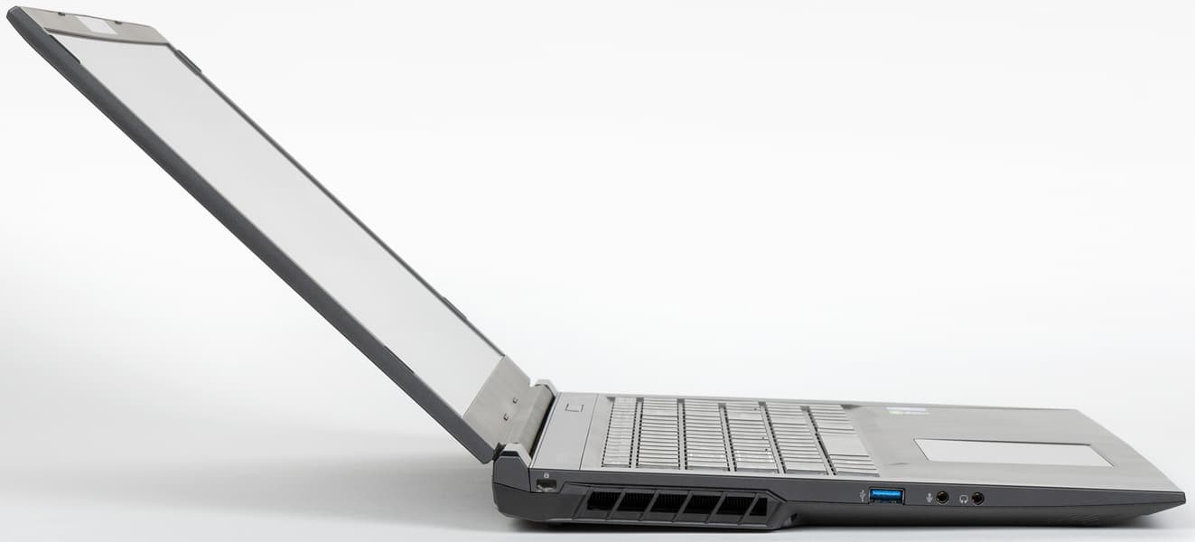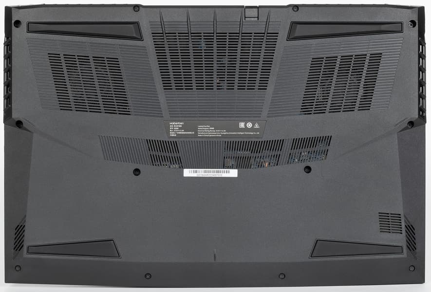 Согласно нашим измерениям, толщина машины с опорами составляет спереди 26 мм, сзади — 33 мм, без опор — соответственно 25 мм и 32 мм, поэтому к разряду тонких ноутбук не отнесешь. Корпус изготовлен из поликарбоната, а не магниевого сплава, но содержит внутри основания металлическое шасси для повышения механической надежности конструкции (об этом чуть подробнее мы расскажем ниже). Вес Maibenben X668, согласно нашим измерениям, составляет 2,48 кг. Добавим к этому еще адаптер питания с кабелем — пристойно играть можно только запитавшись от электрической сети — и получим 3,35 кг, что немного ниже среднего показателя для машин с 17-дюймовыми экранами.