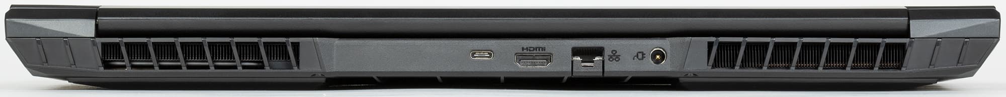 Справа и слева на задней панели видны решетки отверстий, через которые наружу выбрасывается горячий воздух. Между ними помещаются разъем USB 3.1 Gen 2 Type С (с поддержкой DisplayPort), видеовыход HDMI, розетка RJ-45 для подключения к 2,5-гигабитной сети Ethernet и коннектор адаптера питания.