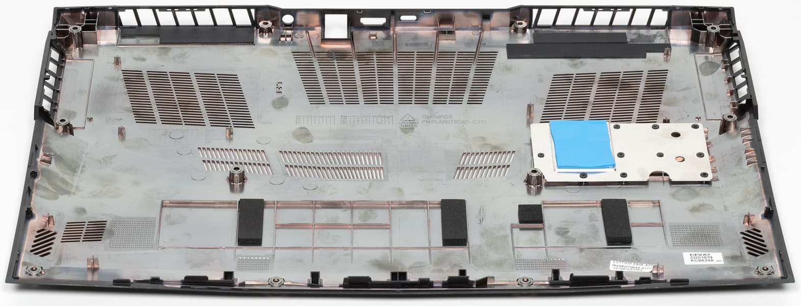 Начнем с того, что мы только что сняли, — с нижней крышки, то есть днища. В отличие от аналогичных деталей в других портативных машинах, она выполняет не только пассивную (механическую), но и активную роль: на ней установлен радиатор с термопрокладкой, предназначенный для отвода тепла от твердотельных накопителей. Несмотря на то, что эта деталь несъемная, ее наличие — очевидный плюс, за что мы благодарим создателей ноутбука.