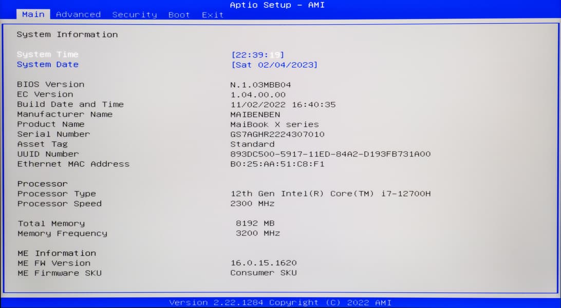 Для вызова установок BIOS нужно после включения питания нажать Del при появлении на экране логотипа Maibenben. Это прерывает начальную загрузку и запускает исполнение утилиты с непривычным названием Aptio Setup (продукт American Megatrends Incorporated). Трактовку первых трех букв мы отыскать не смогли, но в памяти всплыла аббревиатура APT (Application Package Tool) — так в среде программистов именуют набор инструментов для управления установкой, модернизацией и удалением программного обеспечения. Полагаем, что применительно к нашему случаю истина где-то неподалеку. Что касается двух последних букв — IO, — то их вряд ли следует понимать иначе, чем Input/Output (ввод/вывод), и они по-видимому унаследованы от оригинального «BIOS». Однако наши семантические штудии пора прекратить и перейти к подробному описанию Aptio Setup.