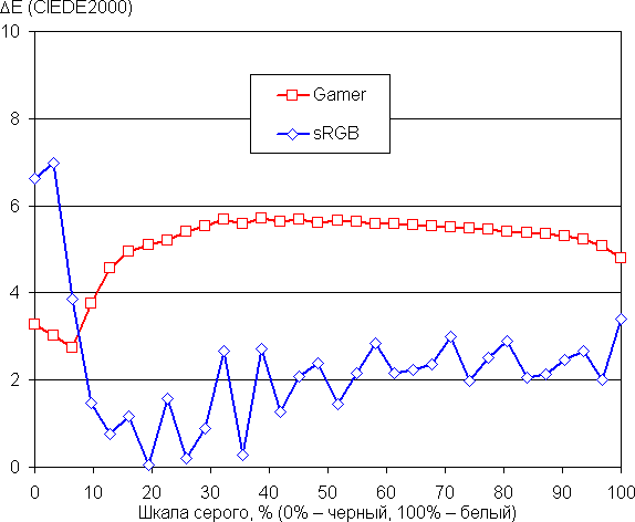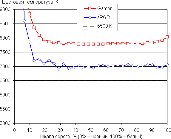 По умолчанию (выбран профиль sRGB) баланс оттенков на шкале серого хороший, так как цветовая температура не сильно выше стандартных 6500 К, а отклонение от спектра абсолютно черного тела (ΔE) ниже 10, что для потребительского устройства считается приемлемым показателем. При этом цветовая температура и ΔE мало изменяются от оттенка к оттенку — это положительно сказывается на визуальной оценке цветового баланса. Впрочем, даже в случае самого яркого профиля Gamer цветовой баланс приемлемый. (Самые темные области шкалы серого можно не учитывать, так как там баланс цветов не имеет большого значения, да и погрешность измерений цветовых характеристик на низкой яркости большая.)