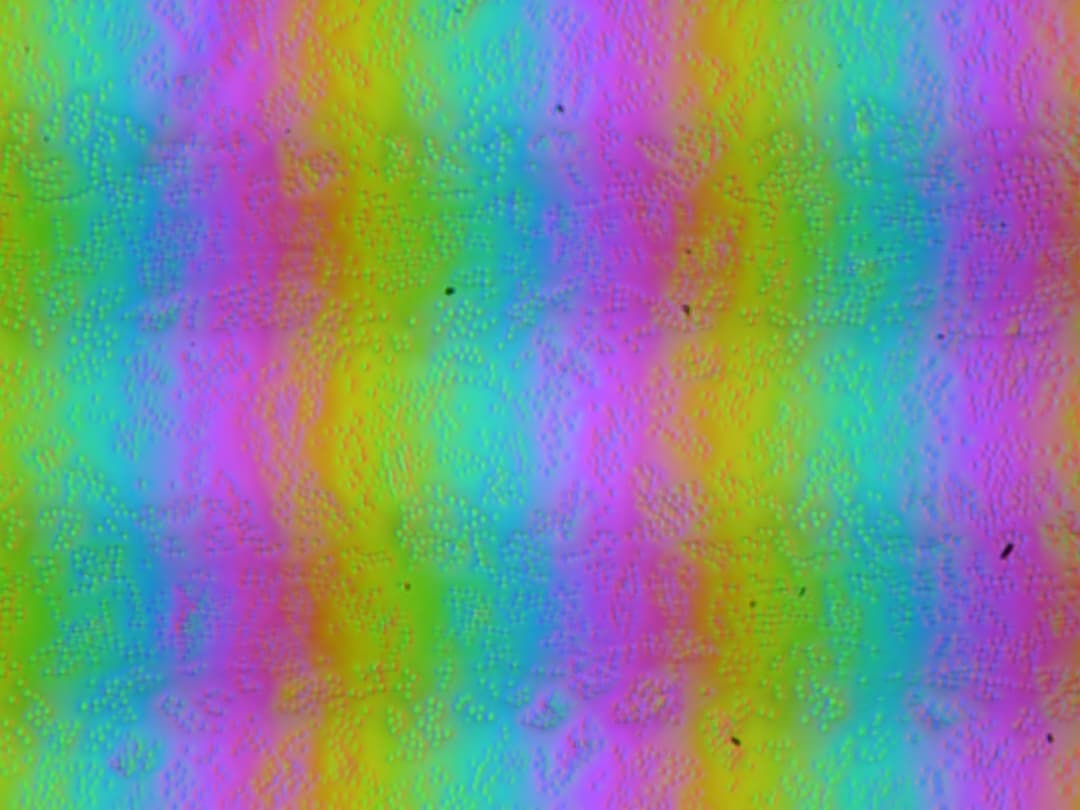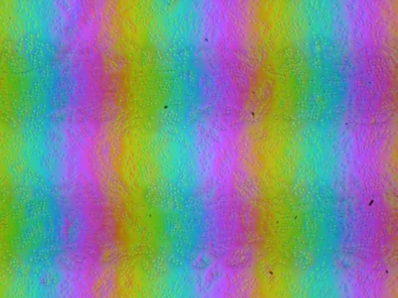 Зерно этих дефектов в несколько раз меньше размеров субпикселей (масштаб этих двух фотографий примерно одинаковый), поэтому фокусировка на микродефектах и «перескок» фокуса по субпикселям при изменении угла зрения выражены слабо, из-за этого нет и «кристаллического» эффекта.