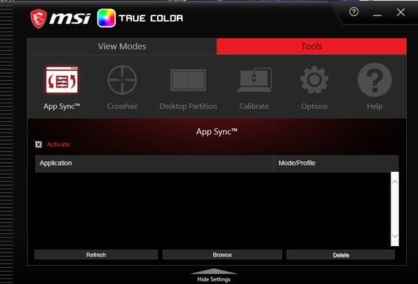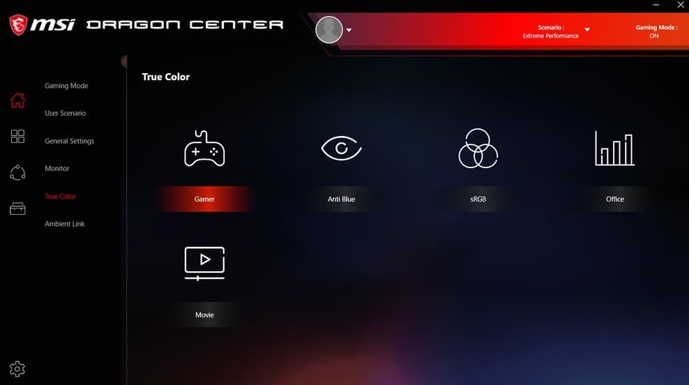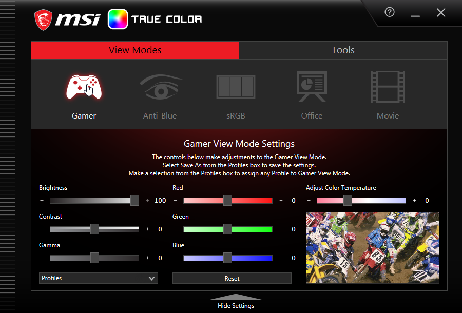 Присутствует фирменная утилита True Color, с помощью которой можно изменить ряд настроек экрана. Доступность настроек зависит от выбранного профиля. По умолчанию выбран профиль sRGB.