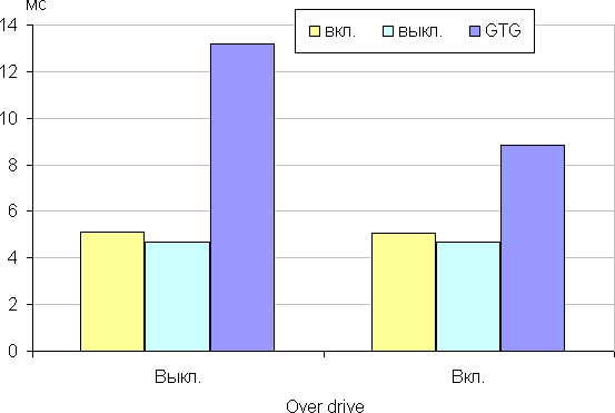 Время отклика зависит от того, включена ли опция Over drive, которая управляет разгоном матрицы. Диаграмма ниже показывает, как меняется время включения и выключения при переходе черный-белый-черный (столбики «вкл.» и «выкл.»), а также среднее суммарное время для переходов между полутонами (столбики «GTG»):