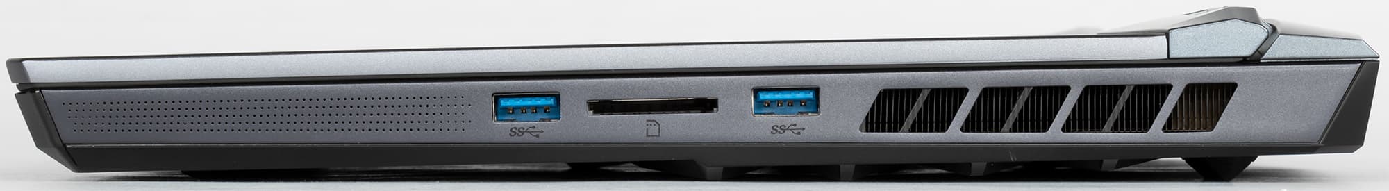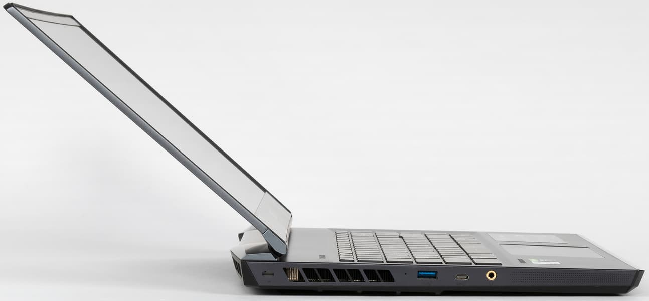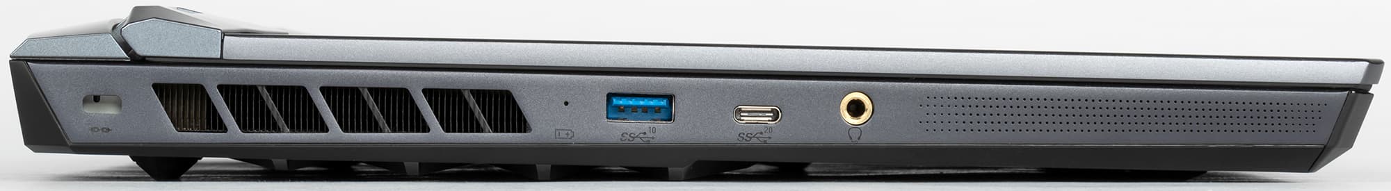 На левом торце расположены кенсингтонский замок, разъемы USB 3.2 Gen2 Type-A (10 Гбит/с) и USB 3.2 Gen2×2 Type-C (20 Гбит/с!), а также комбинированный разъем для гарнитуры.