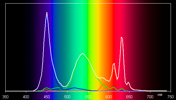 Поэтому визуально цвета на этом экране имеют естественную насыщенность. Ниже приведен спектр для белого поля (белая линия), наложенный на спектры красного, зеленого и синего полей (линии соответствующих цветов):