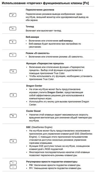 На клавиатуре есть множество горячих клавиш, для включения/выключения тачпада, игрового дисплейного прицела, регулировки громкости динамиков, яркости экрана и т. д.