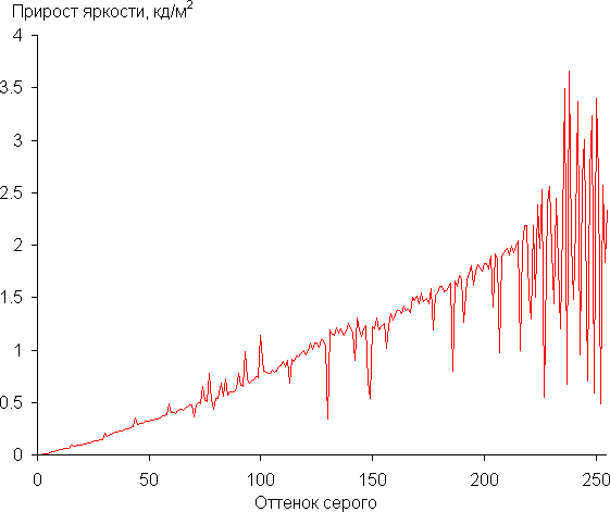 Далее мы измерили яркость 256 оттенков серого (от 0, 0, 0 до 255, 255, 255) при выбранном профиле sRGB. График ниже показывает прирост (не абсолютное значение!) яркости между соседними полутонами: