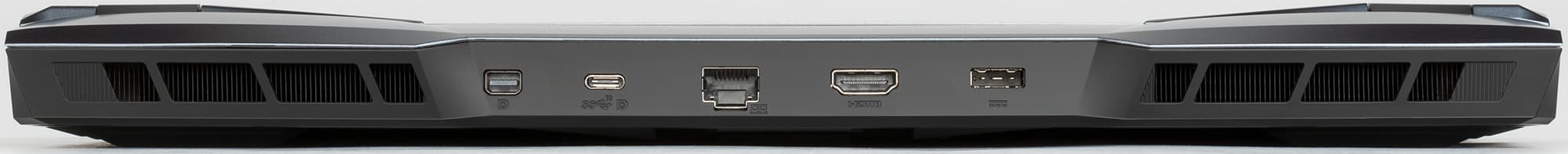 На правом торце — два порта USB 3.2 Gen1 Type-A и картовод для чтения карт SD/SDHC/SDXC. На задней стороне есть разъем адаптера питания, порты RJ-45, HDMI, Mini-DisplayPort и USB Type-C с функцией видеовыхода (DisplayPort).
