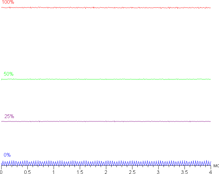 Мерцания (ни видимого, ни выявляемого в тесте на стробоскопический эффект) ни на каком уровне яркости нет. Если подходить совсем строго, то зависимости яркости от времени на низкой яркости выявляют наличие модуляции, но ее характер (частота порядка 24 кГц и небольшая относительно максимальной яркости амплитуда) такой, что никогда и ни при каких условиях мерцание не обнаруживается и не может хоть как-то влиять на зрение пользователя. Приведем графики зависимости яркости (вертикальная ось) от времени (горизонтальная ось) при различных значениях настройки яркости: